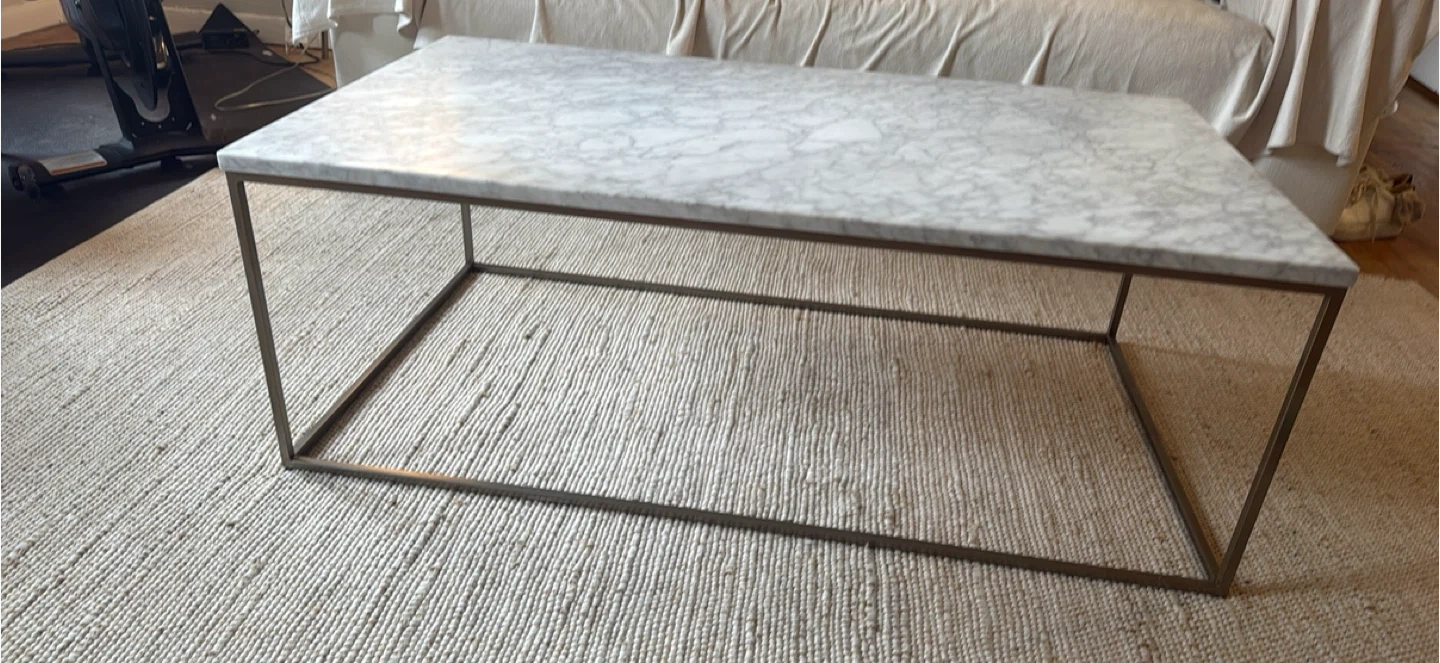 Selling a coffee table with a marble top. The base is a simple metal frame. It's in good condition and would look great in any living room! Minor marks on the coffee table from a cup placed there. Easily can be covered with a coffee table book. Paid $600