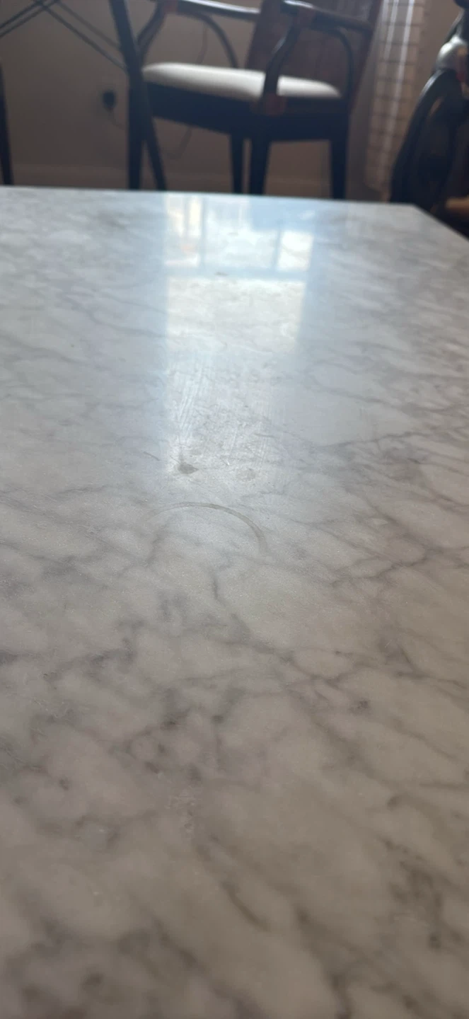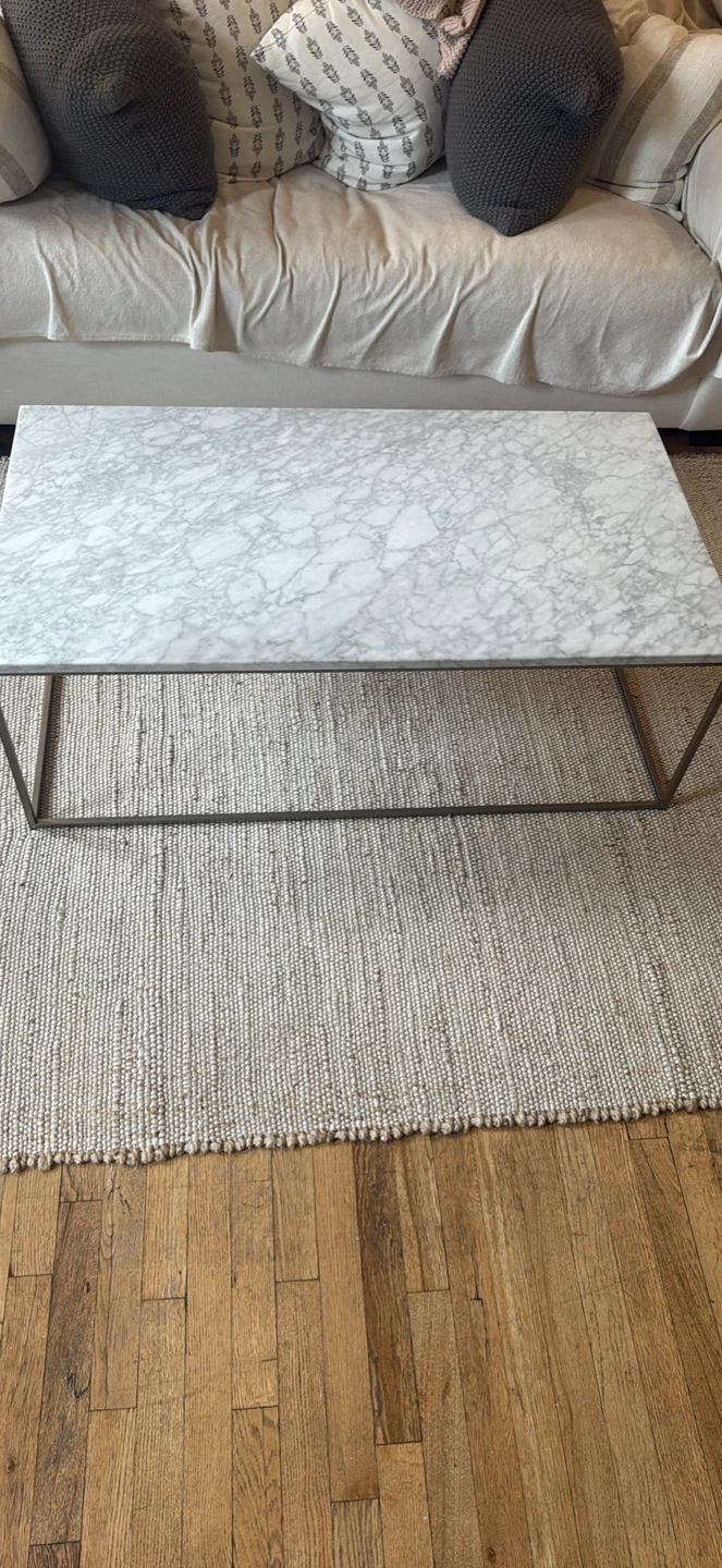 Selling a coffee table with a marble top. The base is a simple metal frame. It's in good condition and would look great in any living room! Minor marks on the coffee table from a cup placed there. Easily can be covered with a coffee table book. Paid $600