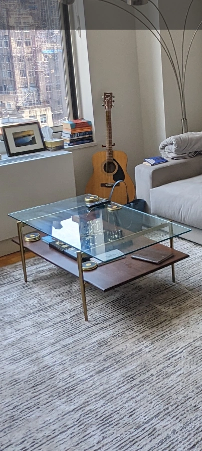 10Selling a West Elm Mid-Century Art Display Coffee Table. It's in great condition and ready for a new home! The table features a glass top and a wooden shelf, perfect for displaying your favorite items. This coffee table is a stylish addition to any living room!