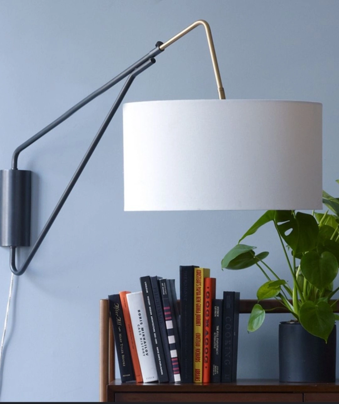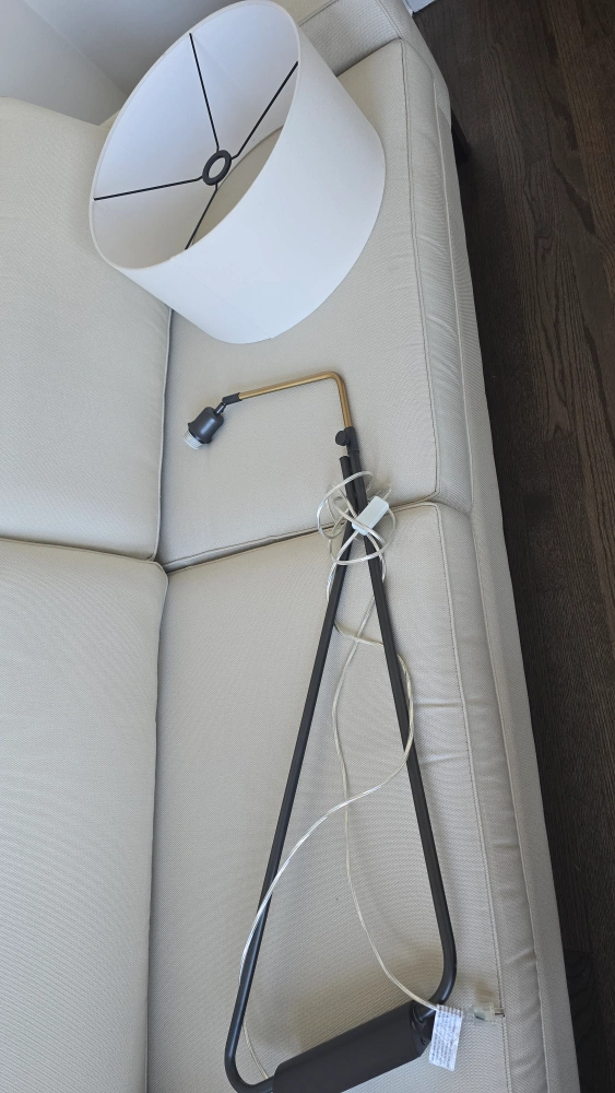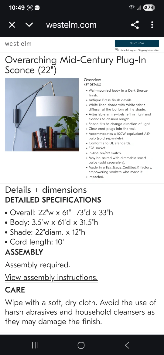 PICK UP IN ANDERSONVILLE (near Clark/Foster) CASH ONLY Selling a West Elm Overarching Mid-Century Plug-In Sconce in dark bronze. The shade is white fabric. It has an adjustable arm that swivels left or right to direct light. Details: - Overall: 22"w x 61"-73"d x 33"h - Body: 3.5"w x 61"d x 31.5"h - Shade: 22" diam x 12"h - Cord length: 10'
