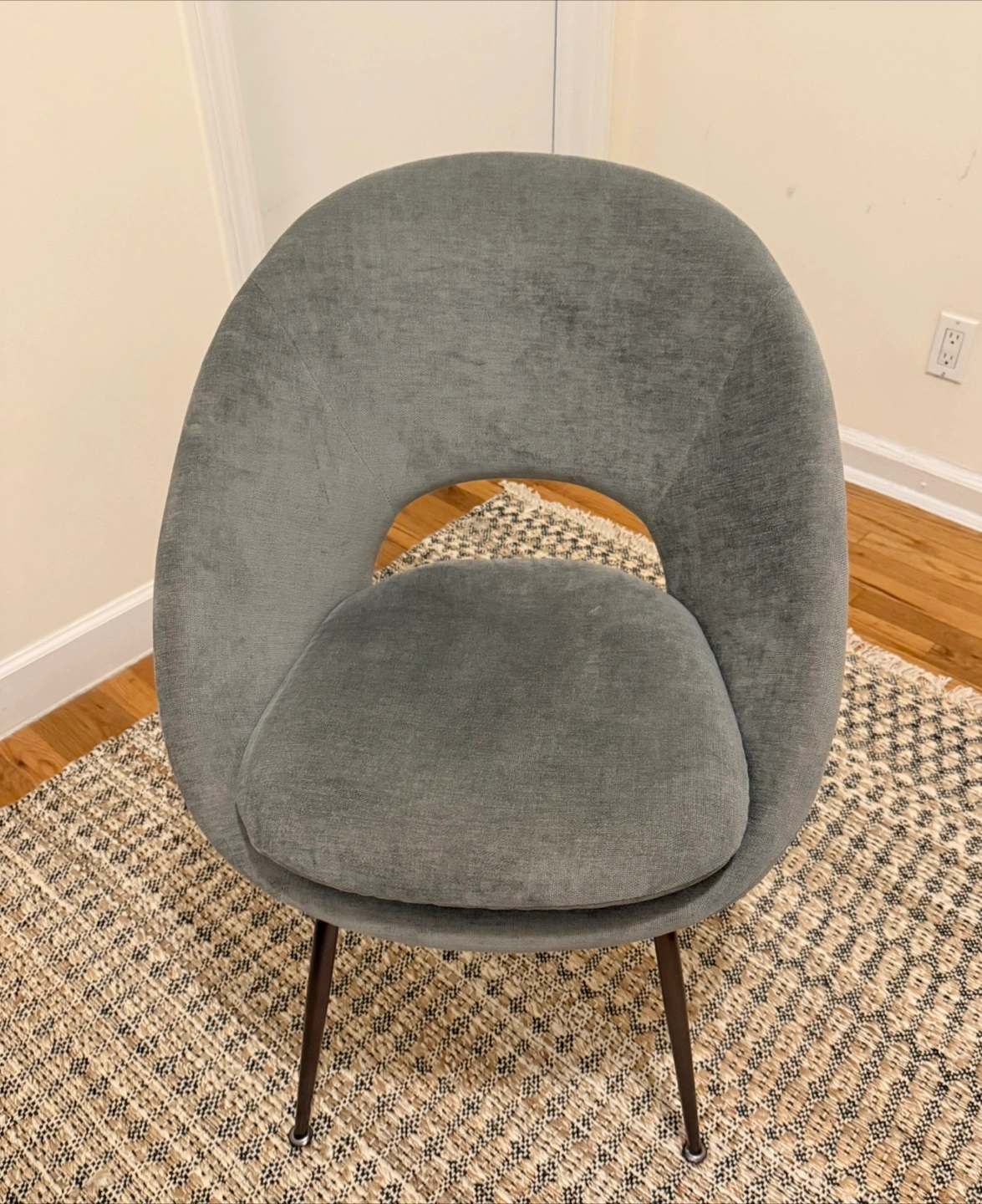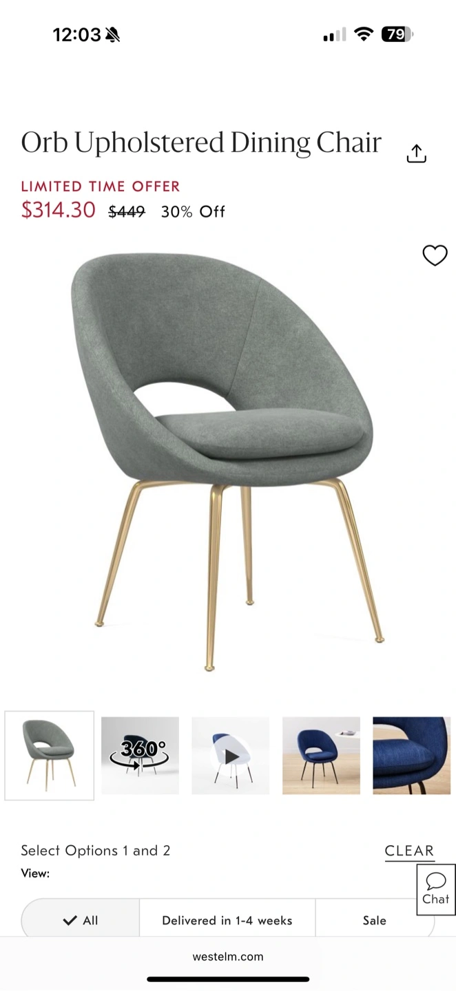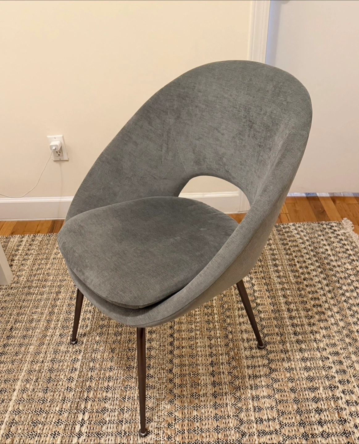 74Selling a West Elm Orb upholstered dining chair! It's in excellent condition and would look great in any living space. I personally used it as a desk chair with my IKEA Alex desk. The chair is gray with bronze/brass legs and features a unique, modern design. It is incredibly comfortable. Originally retail price is $449.