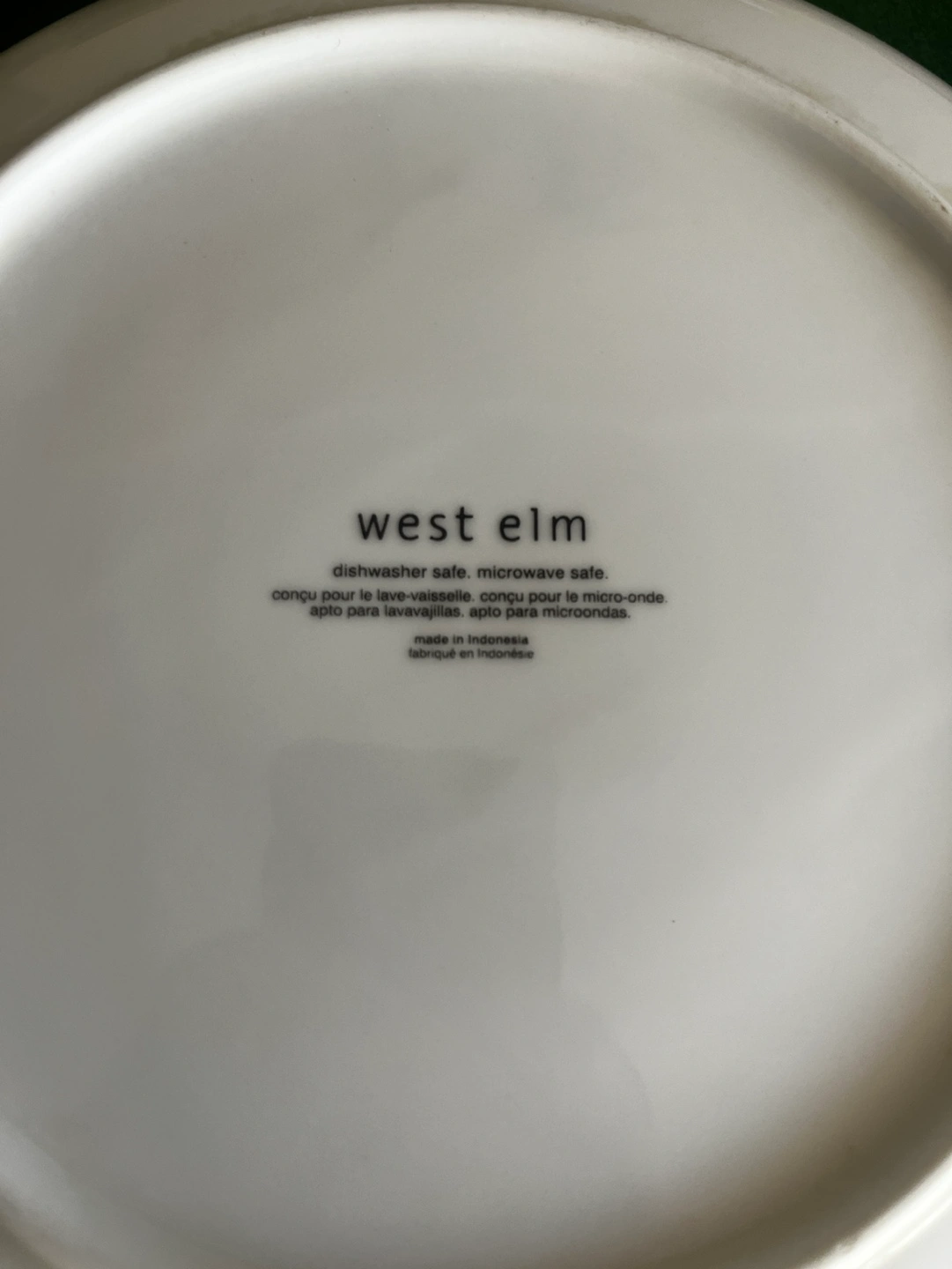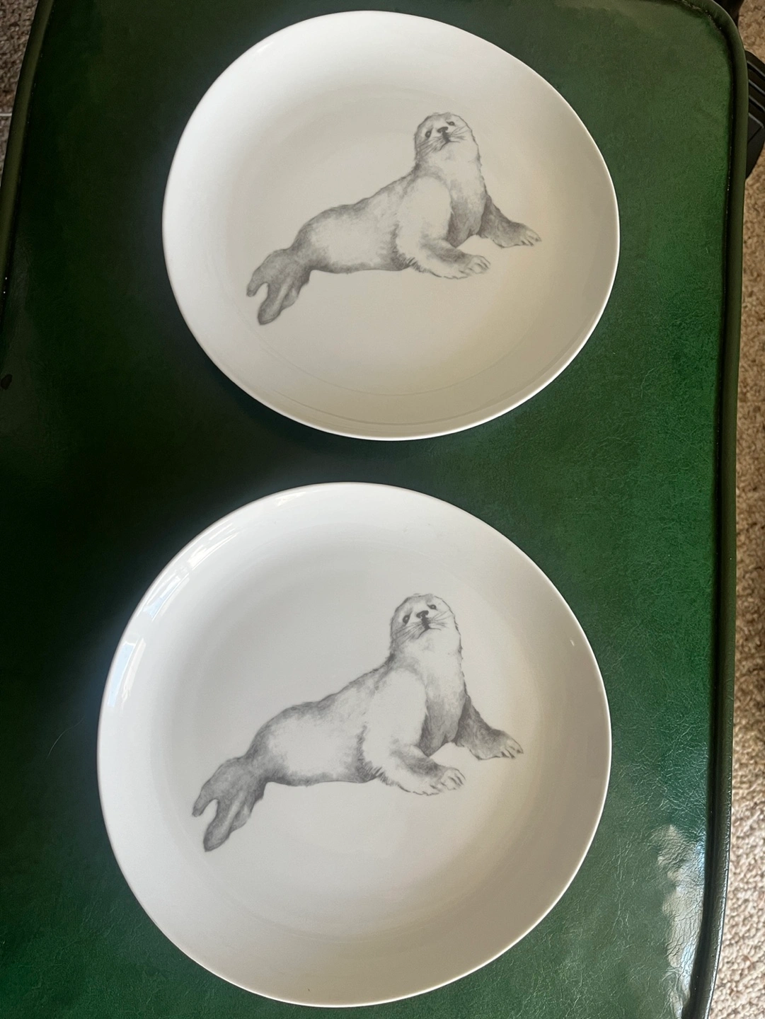 Pair of West Elm plates. Microwave and dishwasher safe. Features a grayscale seal illustration.