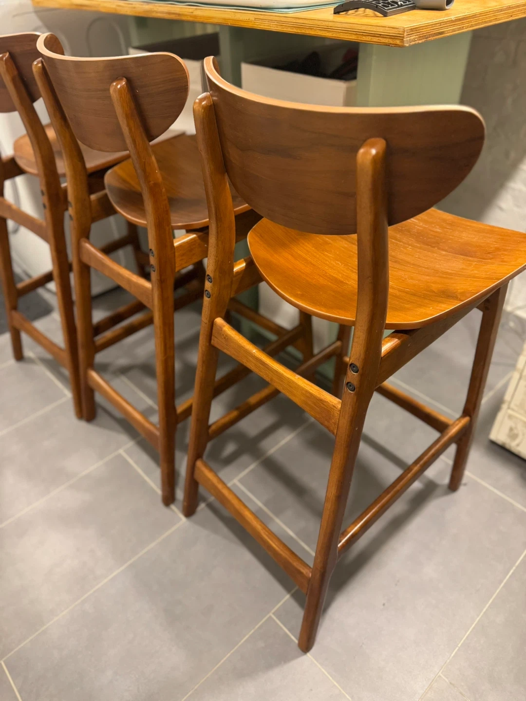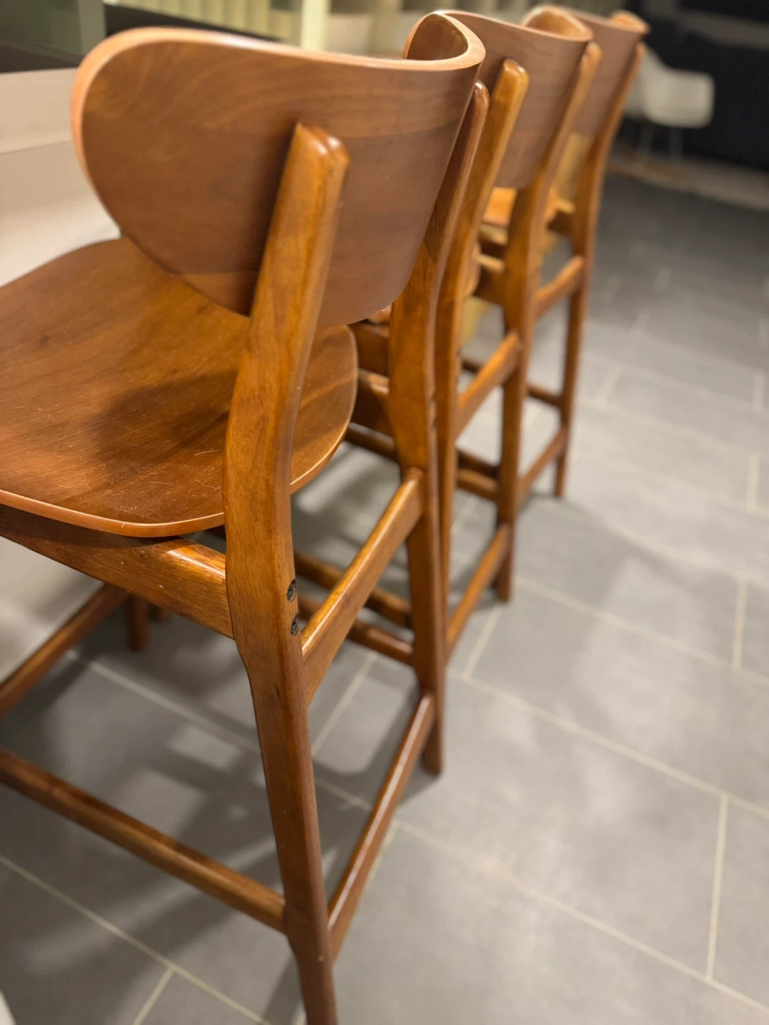 10Selling a set of three wooden bar stools from West elm. Retail price for EACH was $219 plus tax and shipping. They have a classic design and are in really good condition. Perfect for a kitchen island or bar area! West elm site: https://www.westelm.com/products/classic-cafe-walnut-bar-counter-stools-h3193/?pkey=sWE