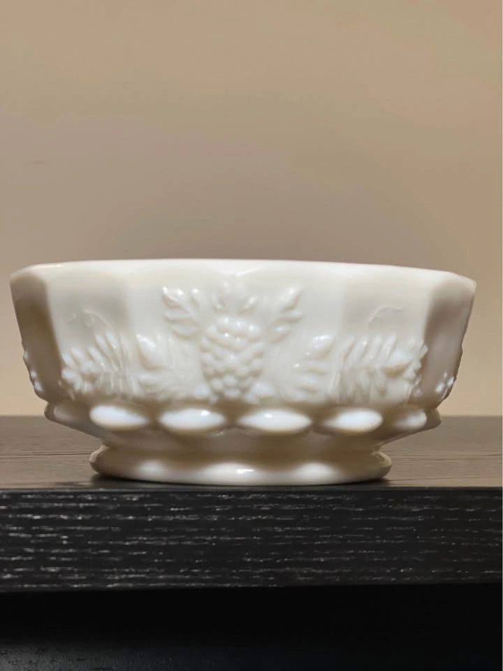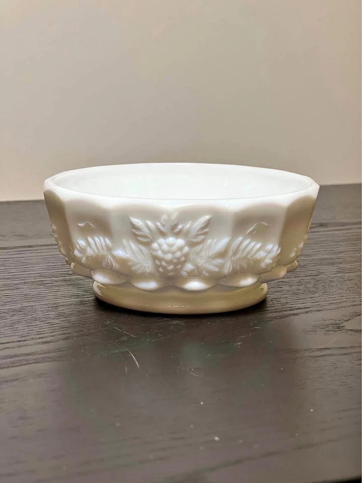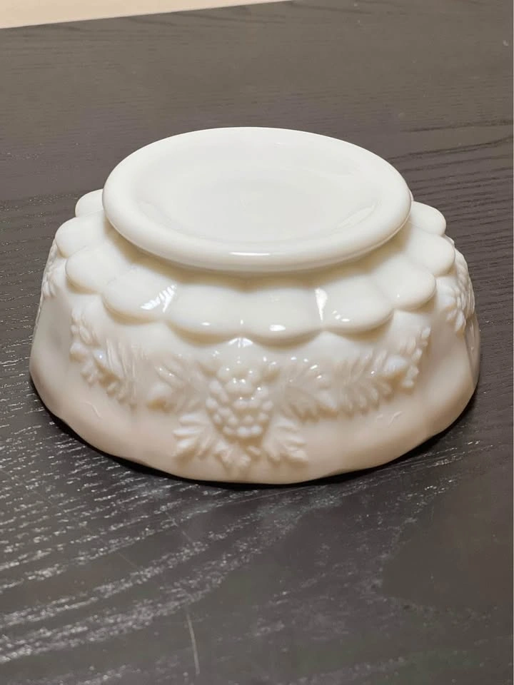 98This beautiful vintage Westmoreland milk glass bowl features the classic Paneled Grape pattern, known for its intricate raised/embossed grape and leaf design. The bowl boasts a lovely scalloped edge and a footed base, adding to its elegant appeal. Westmoreland's Paneled Grape pattern was produced between 1940-1984, making this a genuine vintage piece. Perfect for serving candy, fruit, or as a decorative centerpiece for your home. In excellent vintage condition with no chips or cracks.