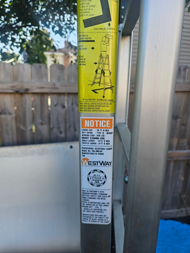 Selling a WestWay 12 ft. 6 inch ladder. Duty rating: Type II, medium duty load 225 lbs. Highest standing level: Single ladder 9 ft. 6 inch. Trestle ladder: 3 ft. 8 inch. Original adjustable ladder model no: 5612-061