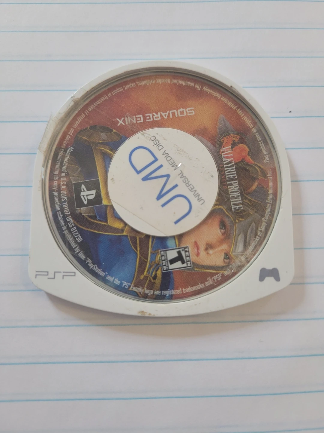 This is a UMD disc for the PSP system featuring the game Valyrie Profile. It's a universal media disc. This game is rated T for Teen.