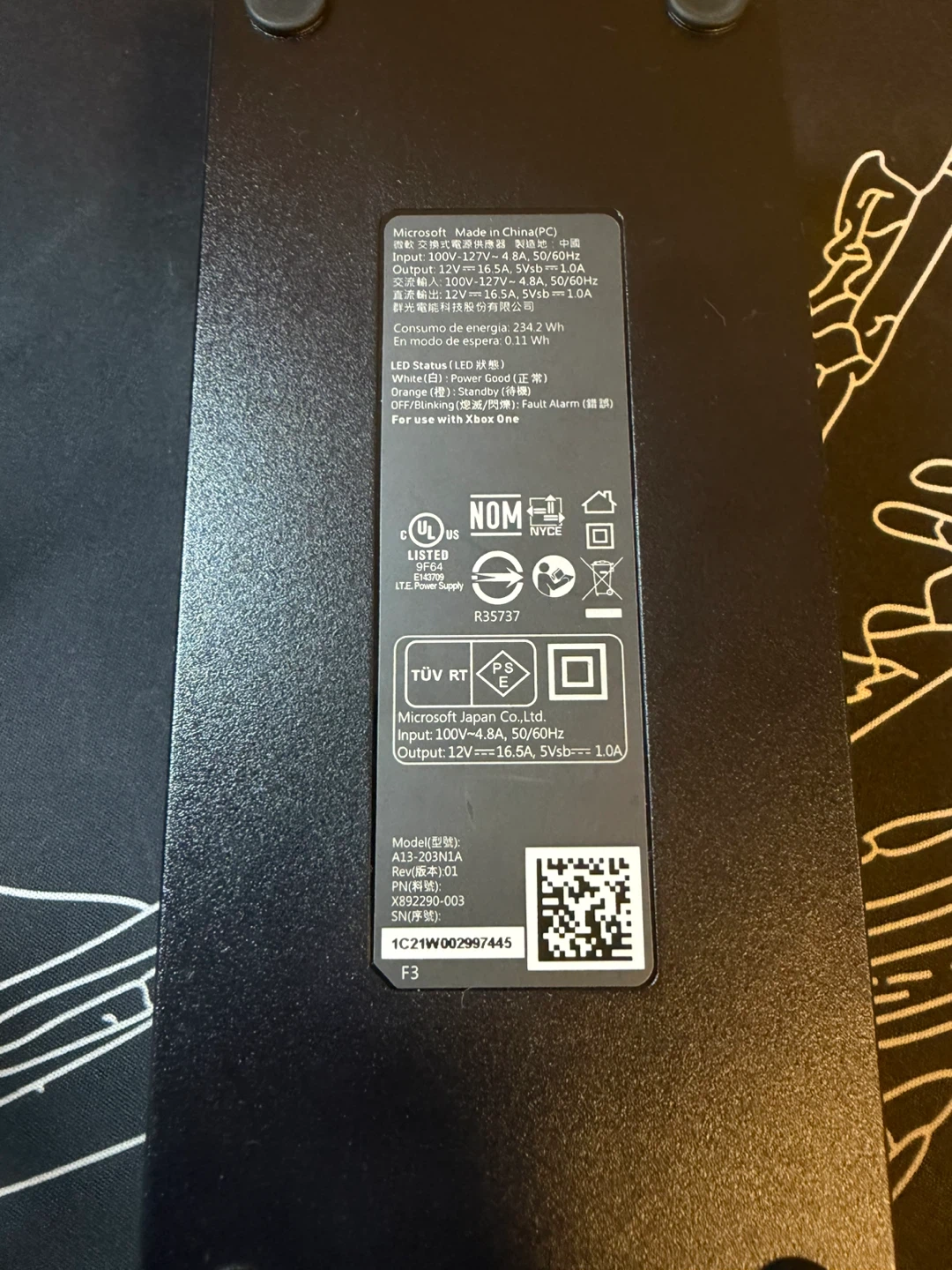 Selling a Microsoft Xbox One power supply. It's in good working condition and ready to power your console! The model number is A13-203N1A. Input: 100V~4.8A, 50/60Hz; Output: 12V==16.5A, 5Vsb==1.0A