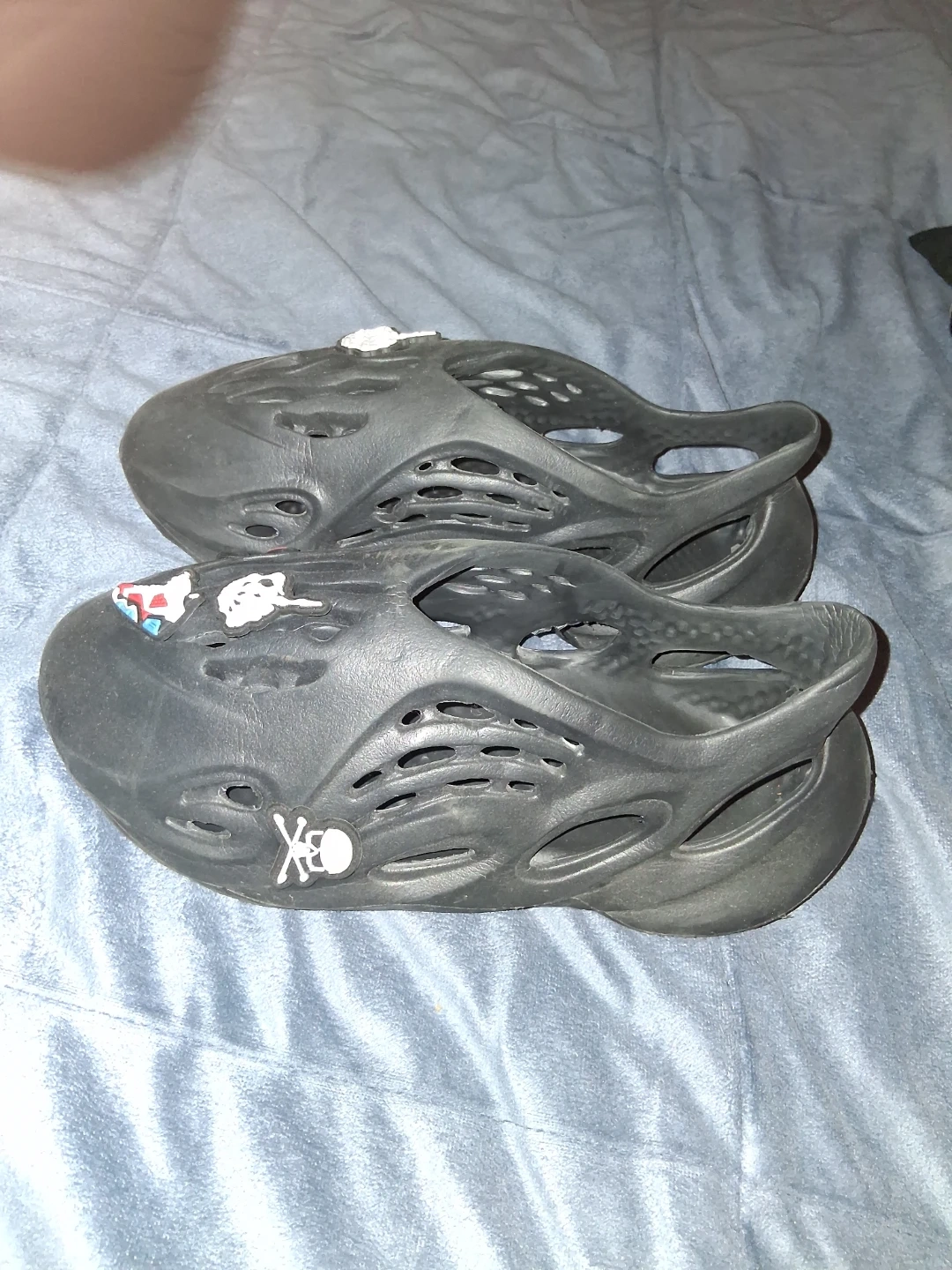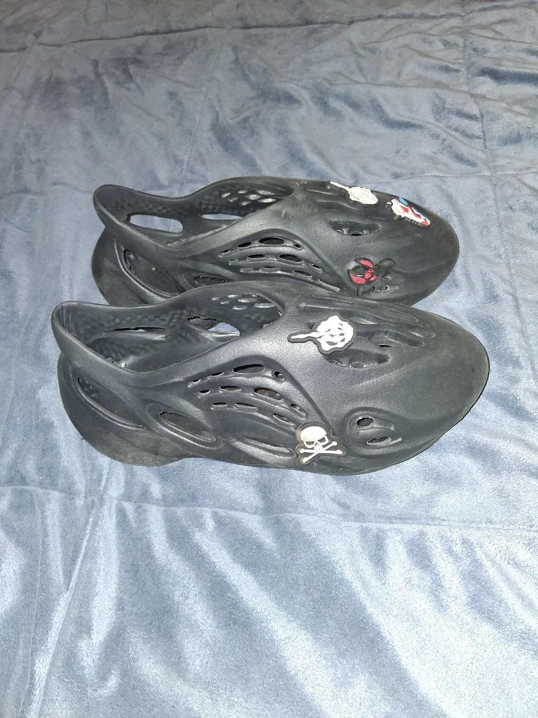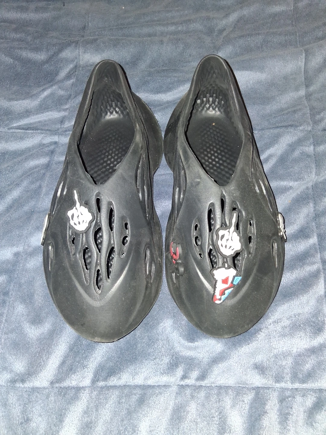 Selling a pair of black foam runner clogs. They have some unique decorative charms added to them. Please see photos for details!