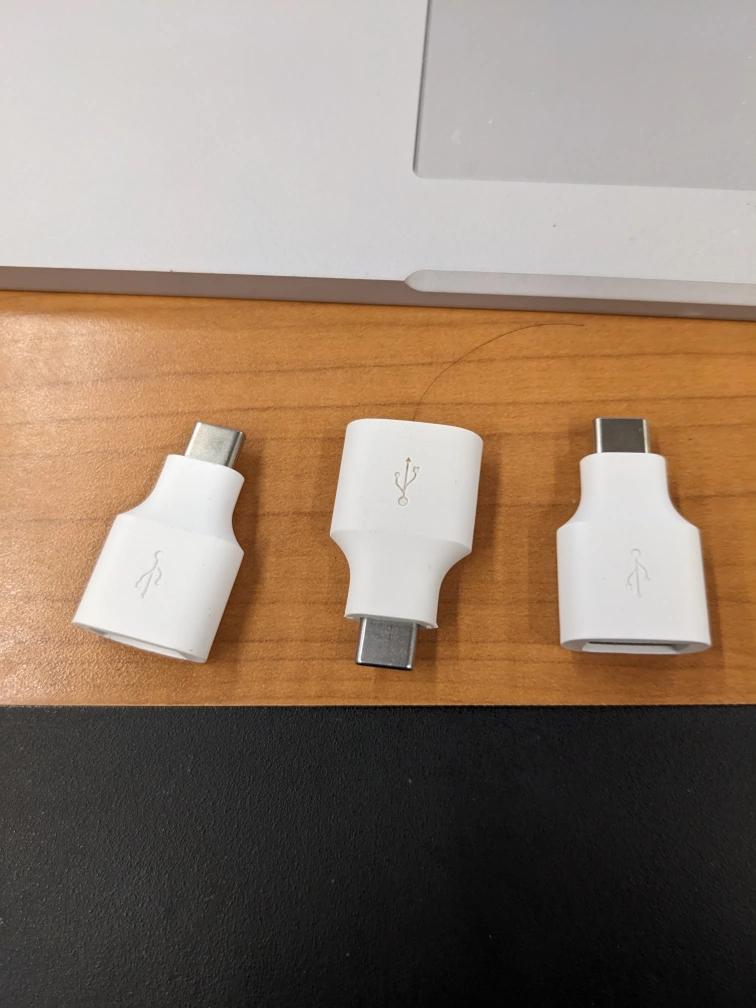 Three white USB-C to USB-A adapters. Small and compact. Perfect for connecting older USB devices to newer laptops. I have 4 of these, $4 each