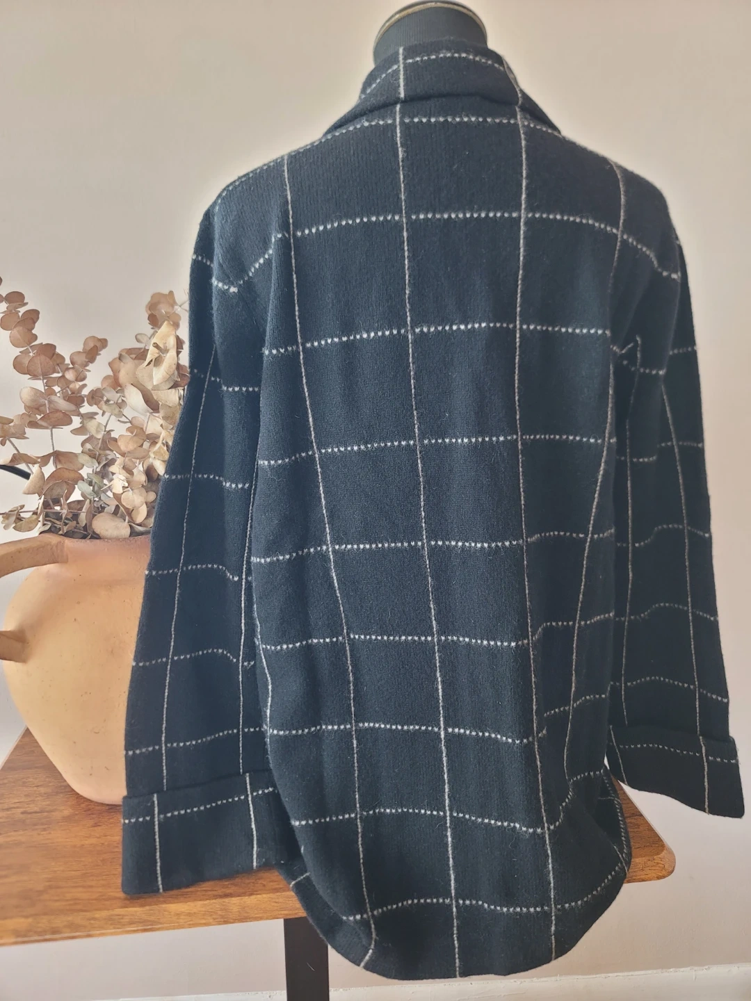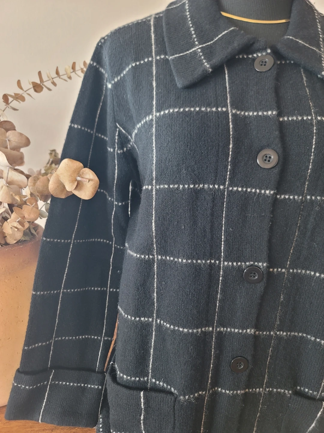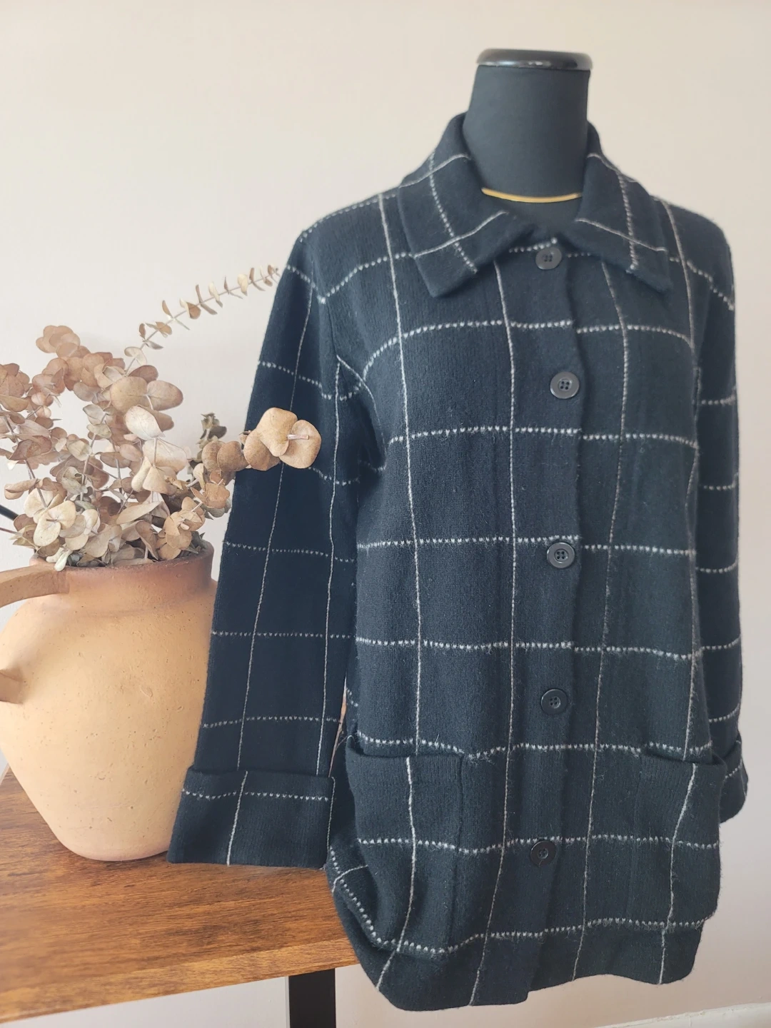 Elevate your style with this elegant black checkered pea coat. Perfect for any occasion, it features a classic #button-up design for a timeless look. #lambswool #wool #shacket #jacket #sweater #peacoat #sustainablefashion #petite #black #checkered #cuffsleaves #preppy #collegiate #businesscasual #contemporary #boho #bohemian #flare #collar #casual #minimal