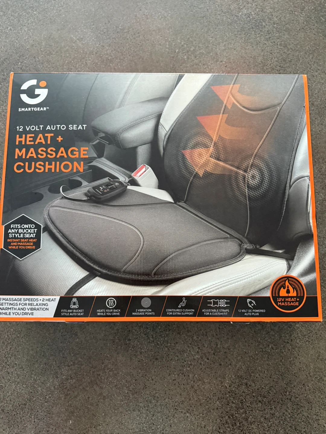 This is a 12 volt auto seat cushion that provides both heat and massage functions. It offers 2 massage speeds and 3 heat settings for relaxing comfort. Adjustable straps ensure it fits securely onto any bucket seat while you drive.