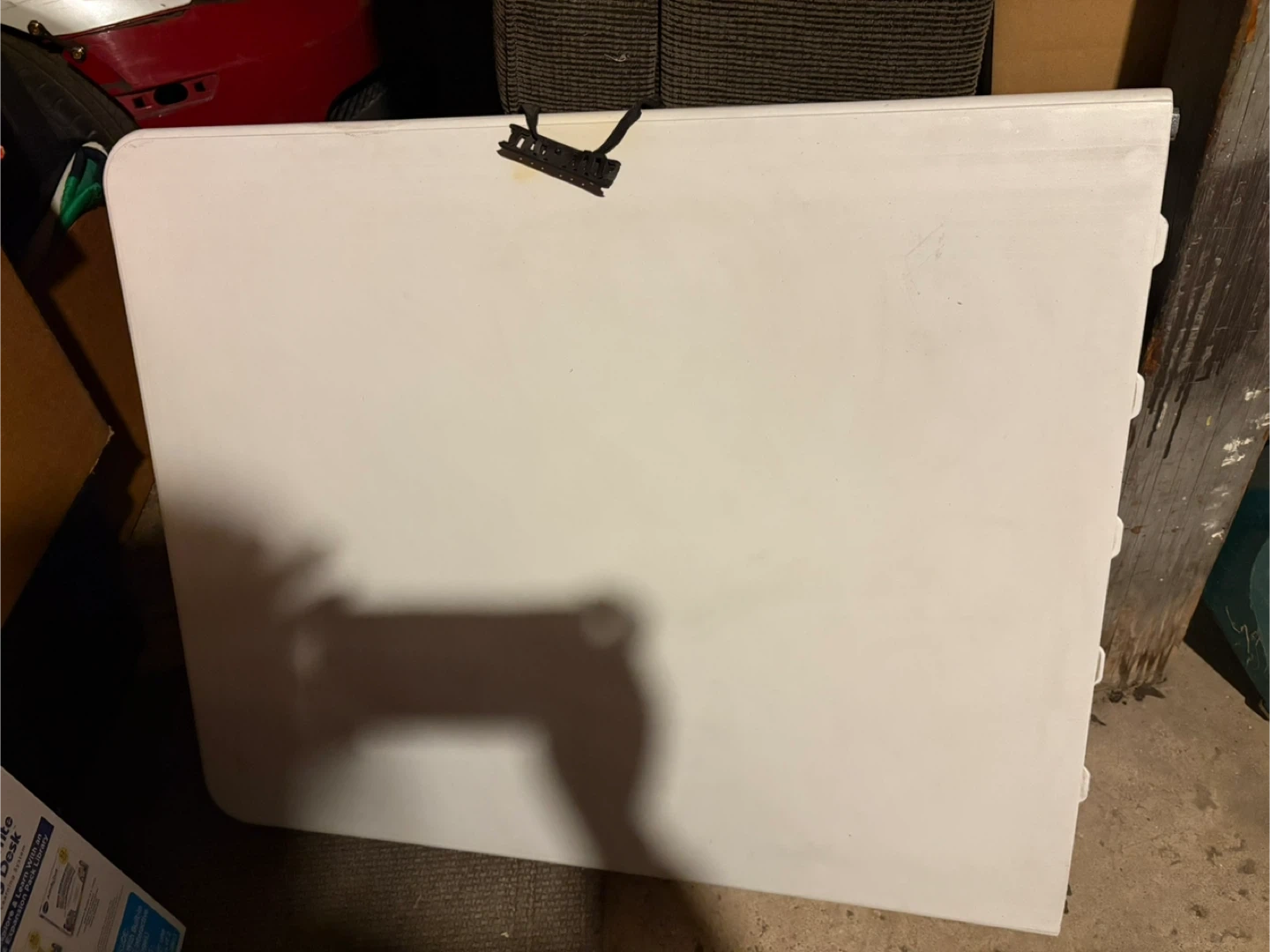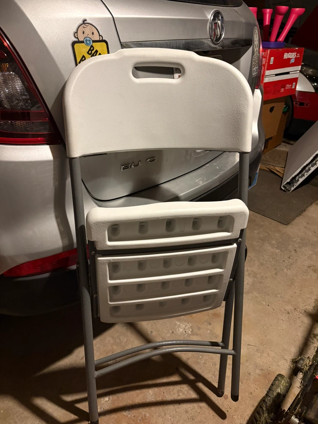 Selling 5 Cosco folding chairs and table set. They're in good condition and perfect for extra seating or activities. The chair is white with a gray frame, and the table is also white. Great for indoor or outdoor use!