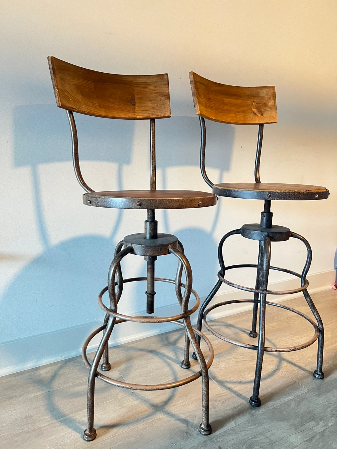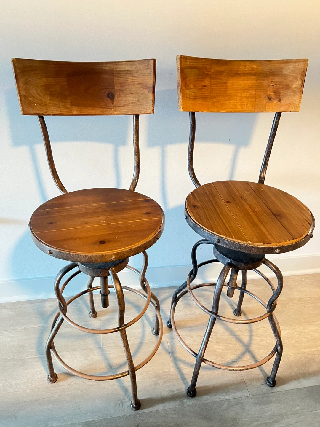 Selling a set of two wooden swivel bar stools!The stools feature a rustic design with a wooden seat and backrest, and a sturdy metal frame. They swivel smoothly. Noting that one stool’s base is loose but can still sit without any problems or easily fix but with screws