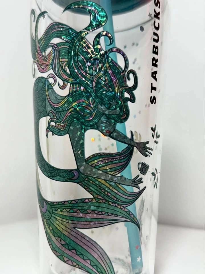 This design features the brand's iconic siren logo depicted as a mermaid with a shimmering, color-changing design and loose glitter at the base.
