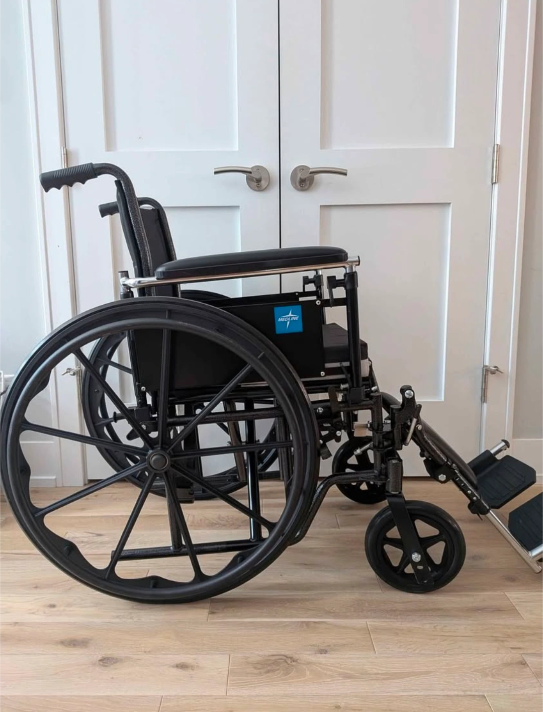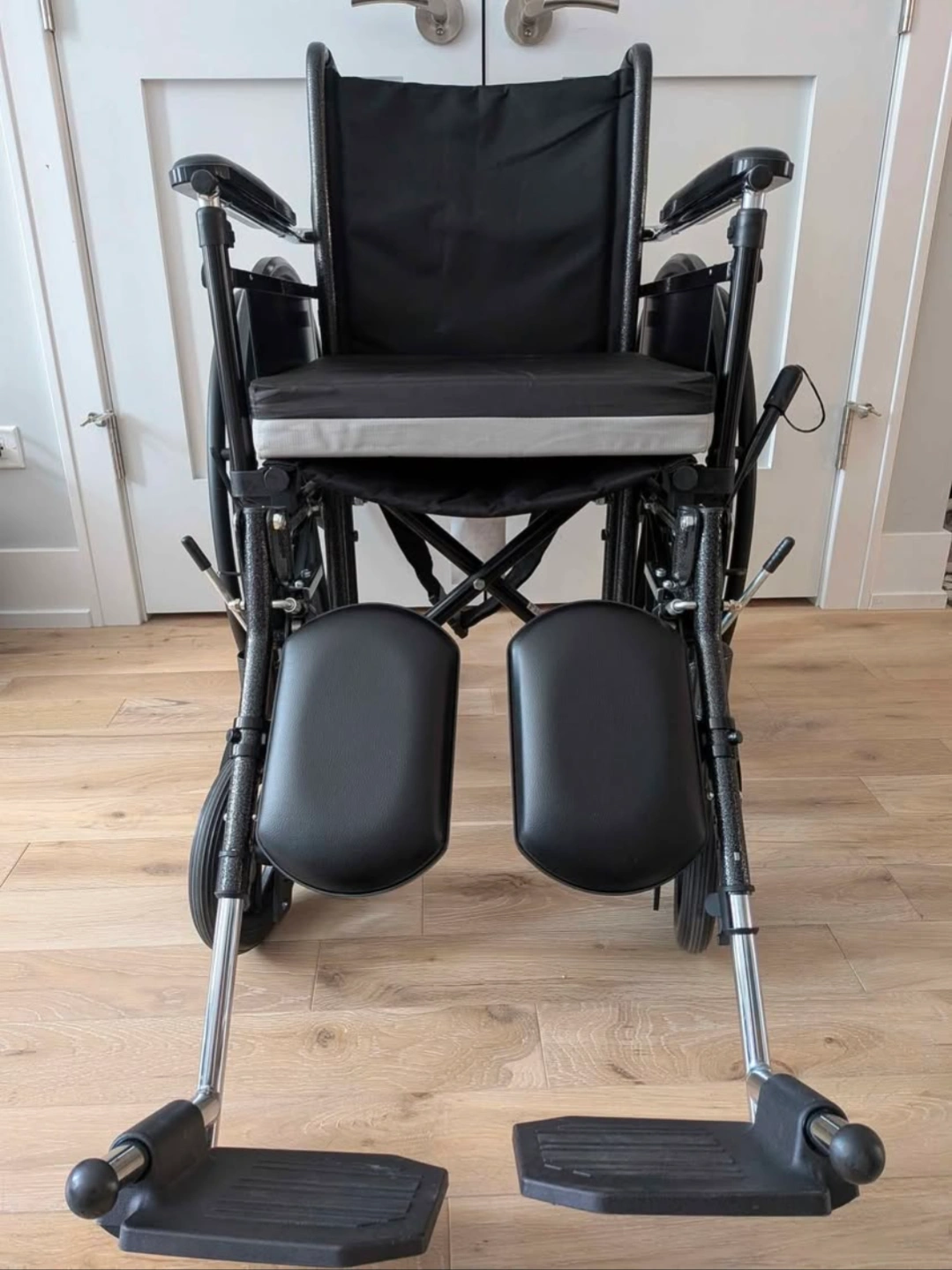 Black wheelchair. Features armrests, and footrests. The wheels are large. A good option for comfortable mobility. Seat pad is 16x16x3
