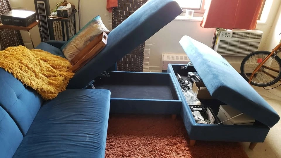 4 Piece Teal Blue Sofa set w/ Mustard Yellow blanket (3pcs contain storage)