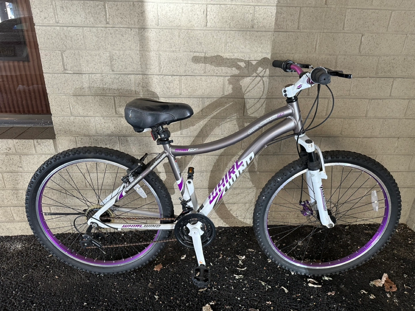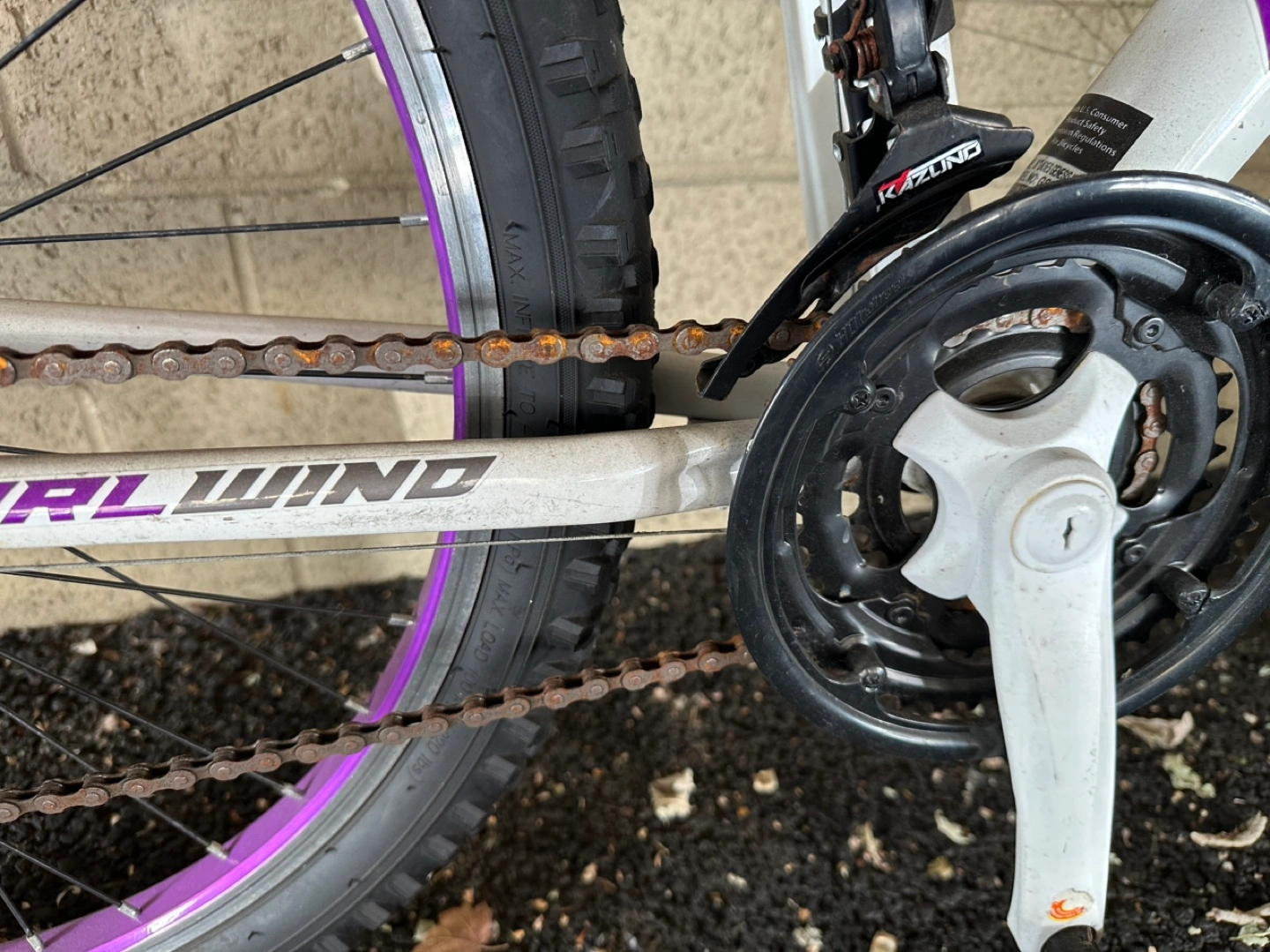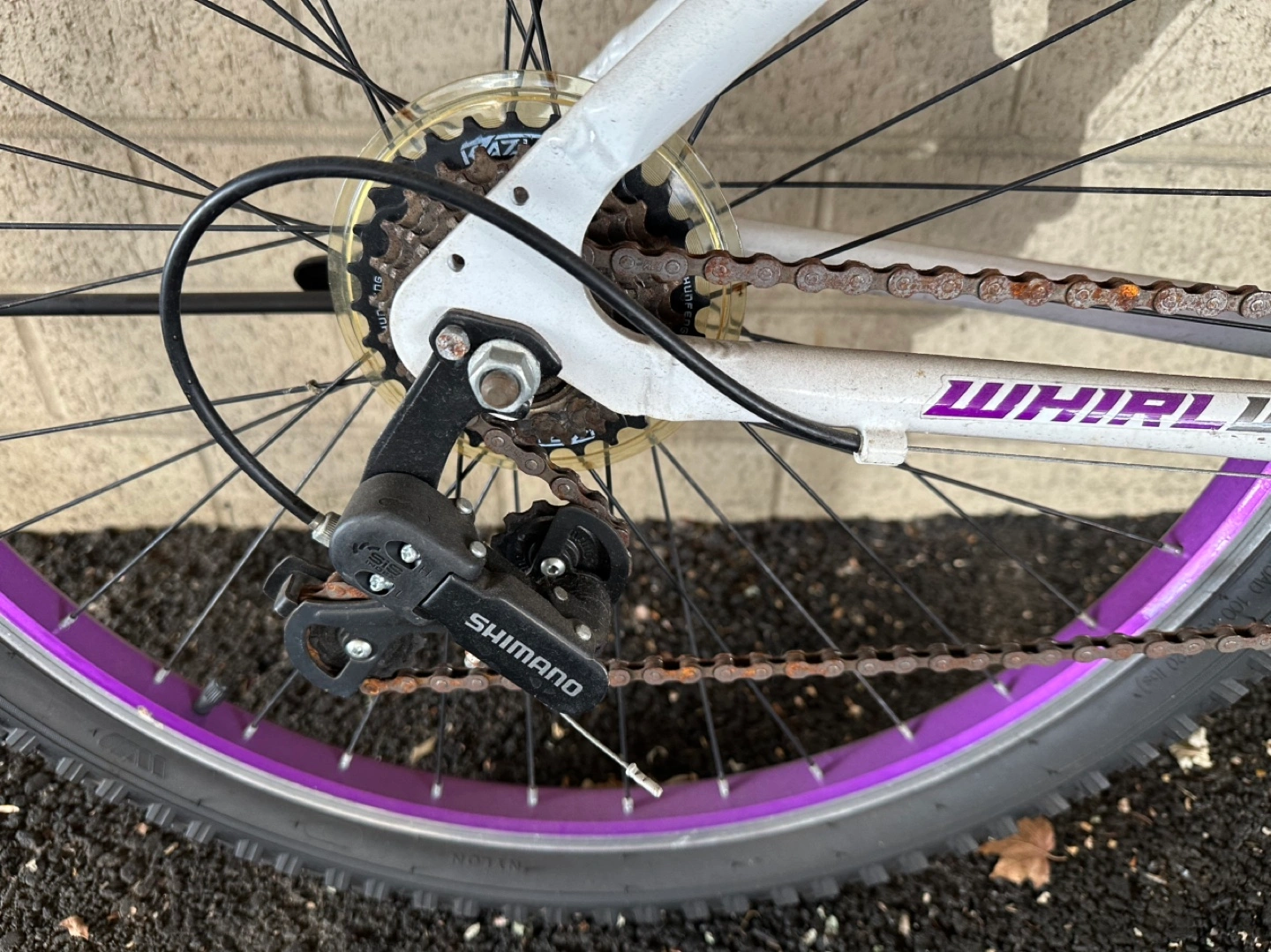 White and purple mountain bike with Shimano gears. 24 inch wheels. Rusted chain and breaks need to be adjusted. Seat is not original one. It was exchanged for a larger, more comfortable seat. Pickup only.