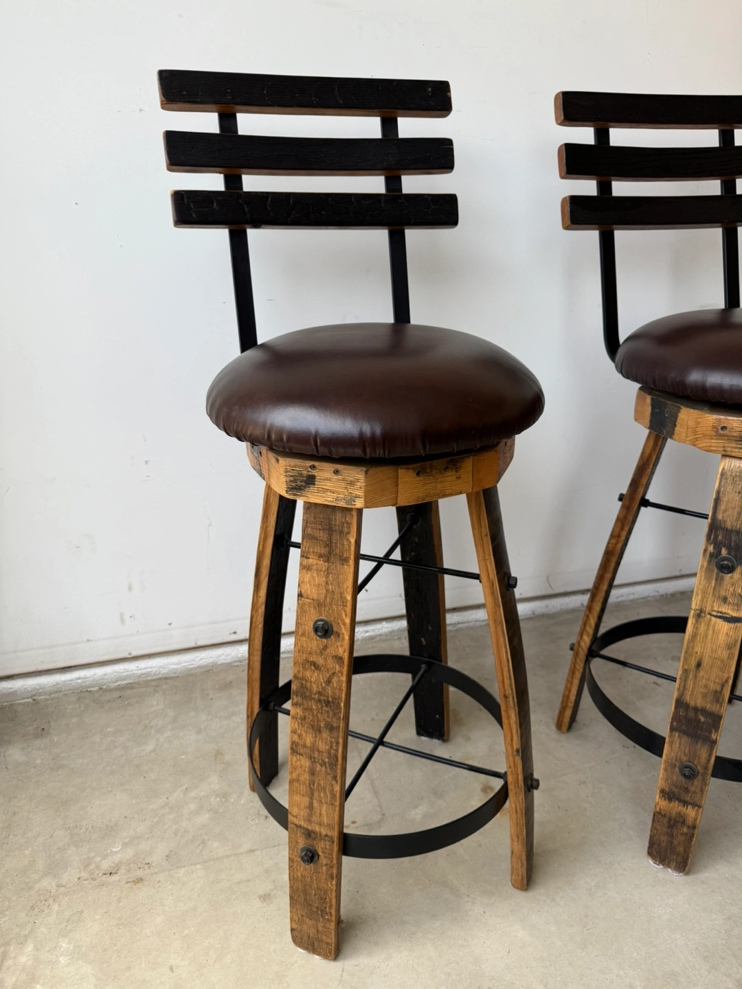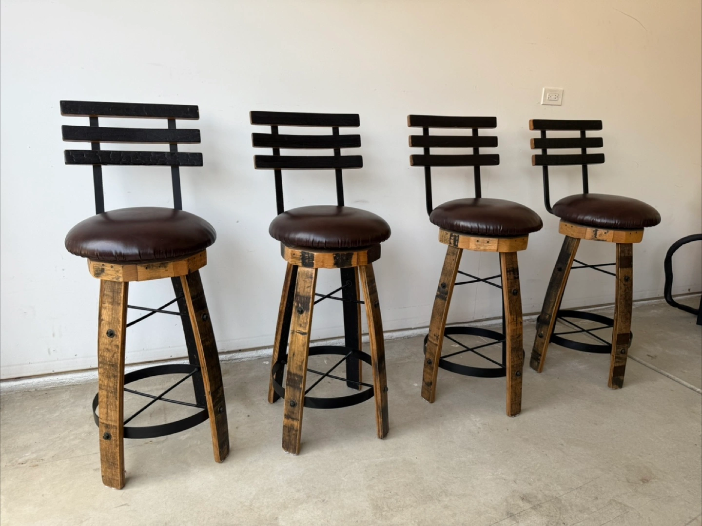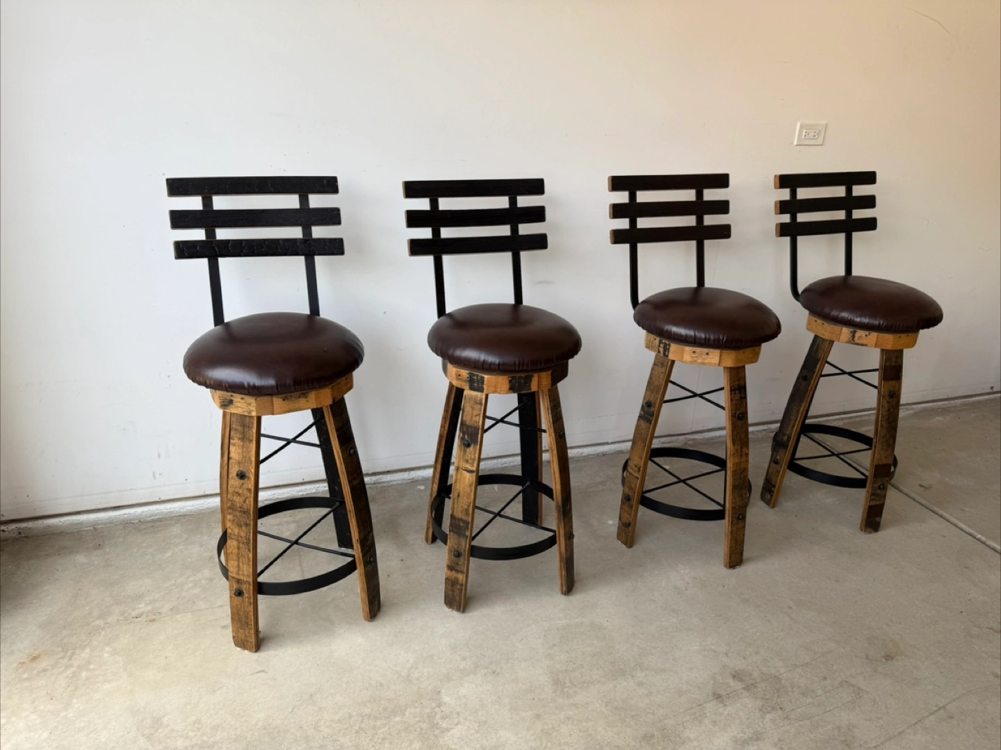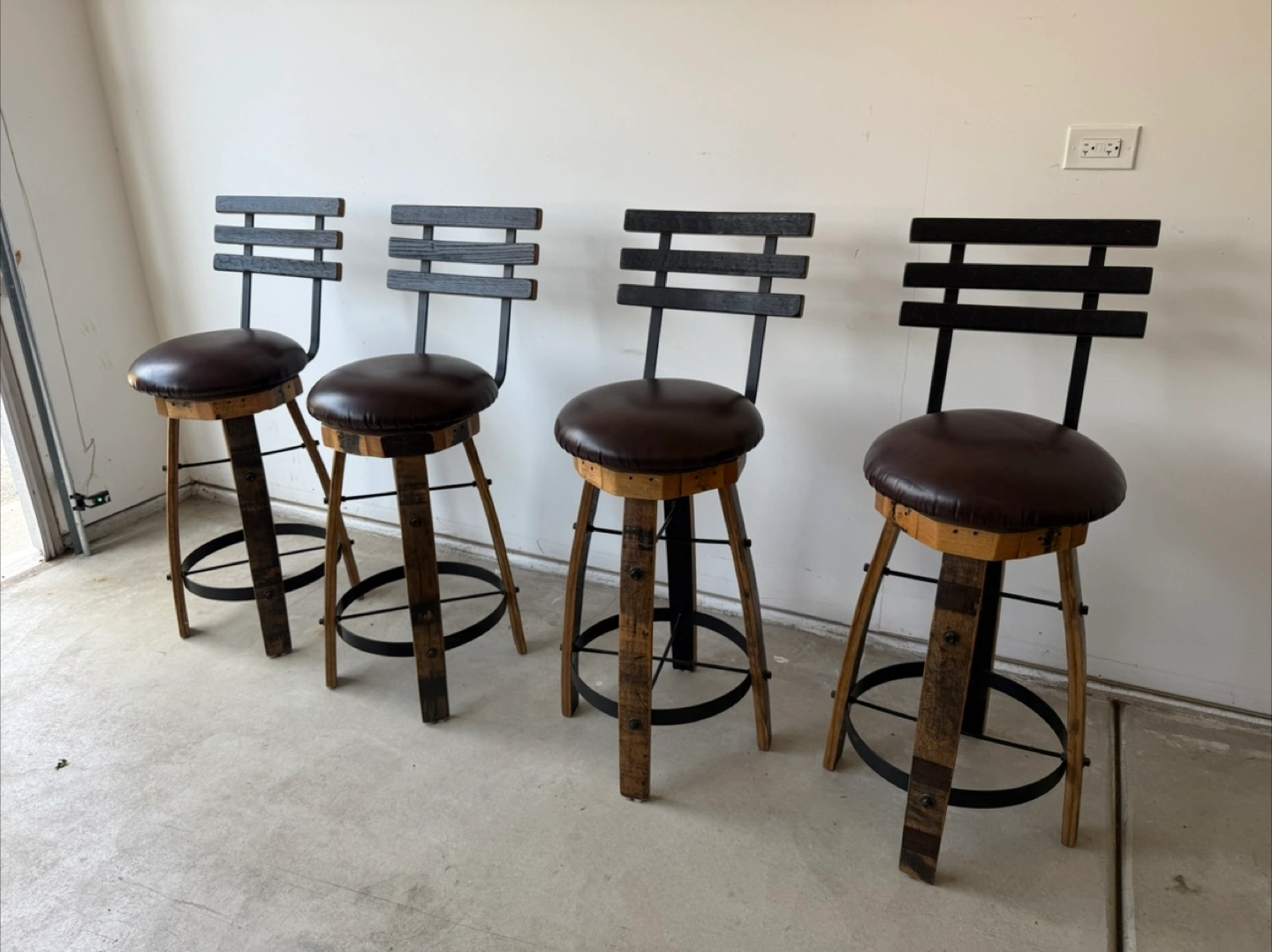 76Set of 4 Whiskey Barrel Stave Bar Stools – 30” Pub Height – Barely Used! Price: $800 for the set (retail is $1,076+) Condition: Gently used – excellent like-new condition Pickup in Edison Park, Chicago – Cash or Venmo, or Zelle accepted ⸻ Upgrade your space with this beautiful set of 4 handmade bar stools, crafted from authentic reclaimed whiskey barrel staves. These are 30” pub height with ultra-sturdy construction, comfortable swivel seats, and a rustic-industrial design that fits perfectly in a bar, kitchen island, or entertainment area. ⸻ Product Details: • Handcrafted in Ohio from real whiskey barrel wood • Swivel seat with padded faux leather cushion and supportive backrest • Heavy-duty iron foot ring for comfort and durability • Color: Dark brown wood with black faux leather seats • Height: 30” (pub height) ⸻ Why I’m Selling: We used these briefly in our last home and loved them, but they unfortunately don’t fit in our new space. They’ve had minimal use and are in fantastic condition—no scratches, no wobble, and all hardware is solid. ⸻ Great Value: • Retail price: $269 each ($1,076 total) • My price: $800 for the full set of 4 • You save $276 for stools that are basically new! ⸻ Let me know if you have any questions or would like to schedule a time to see them. These are truly unique, high-quality stools that will last for years.