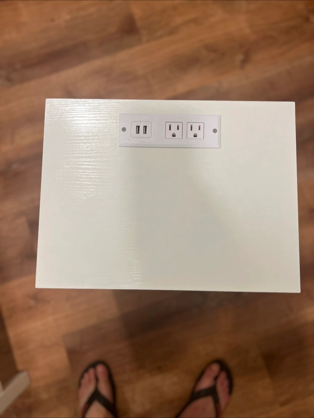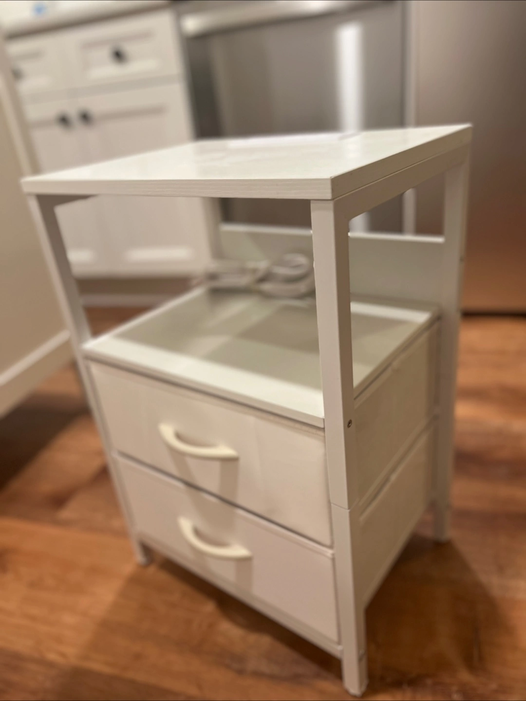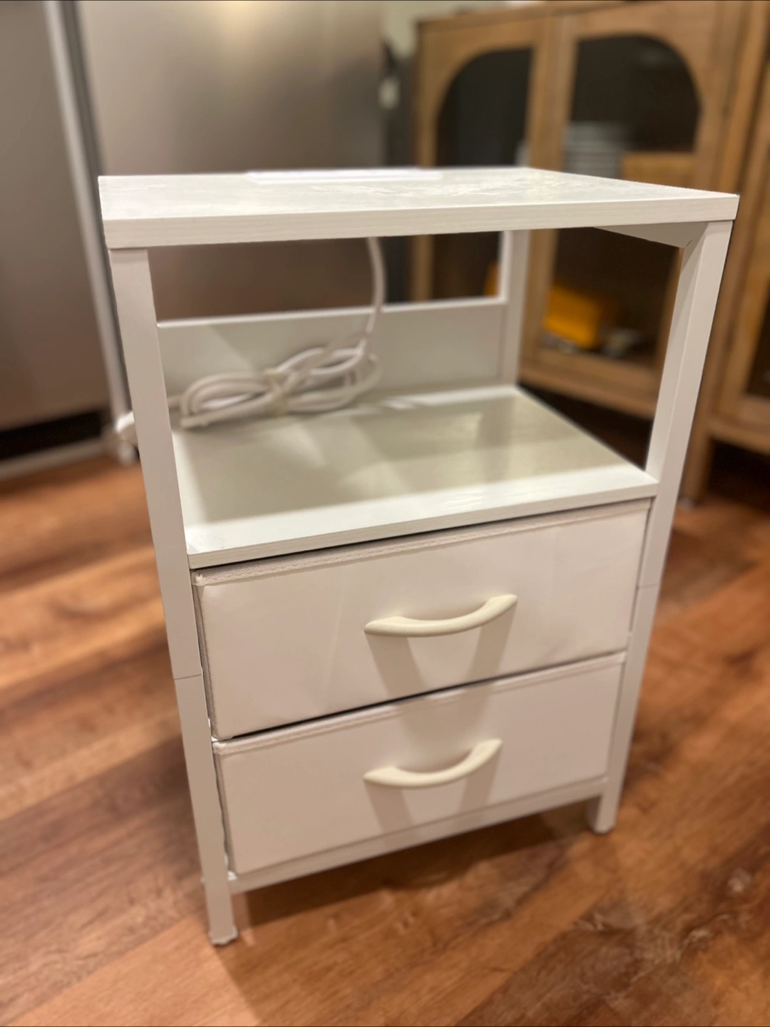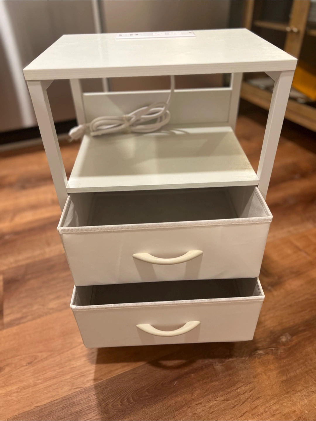 Small white nightstand. Two fabric drawers. Built-in power strip with two USB ports and two AC outlets. Perfect for bedroom or small space.