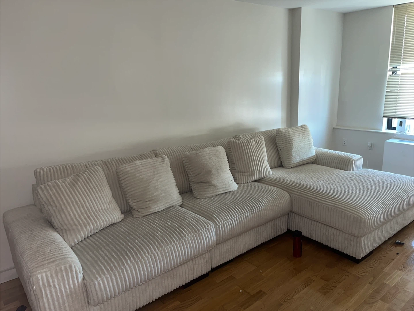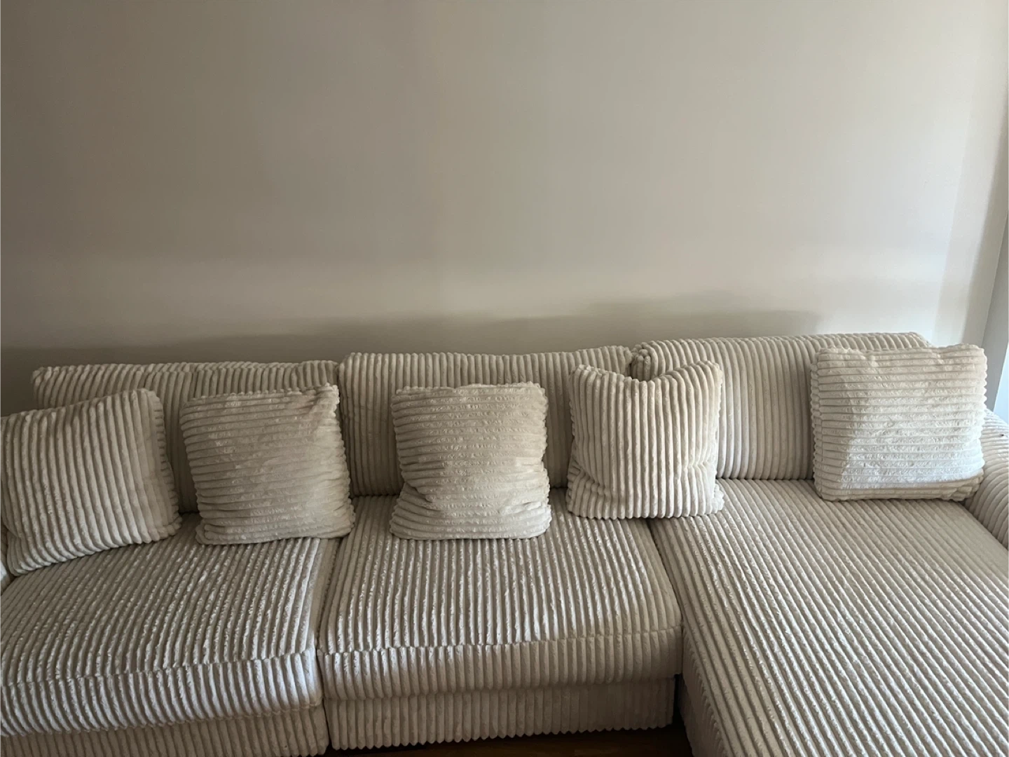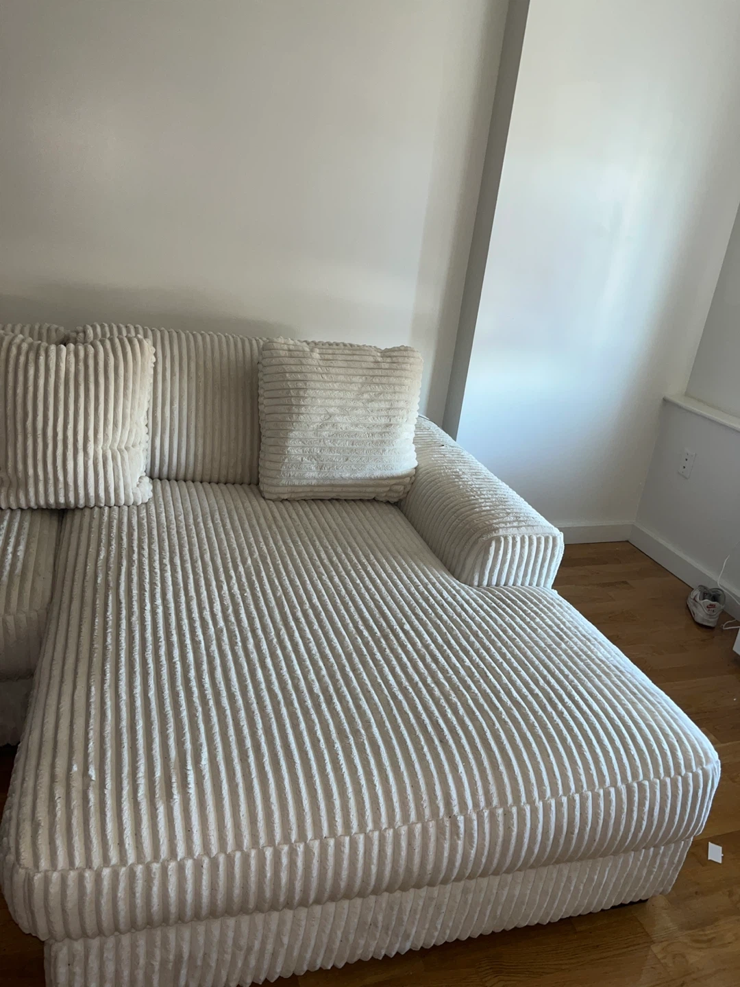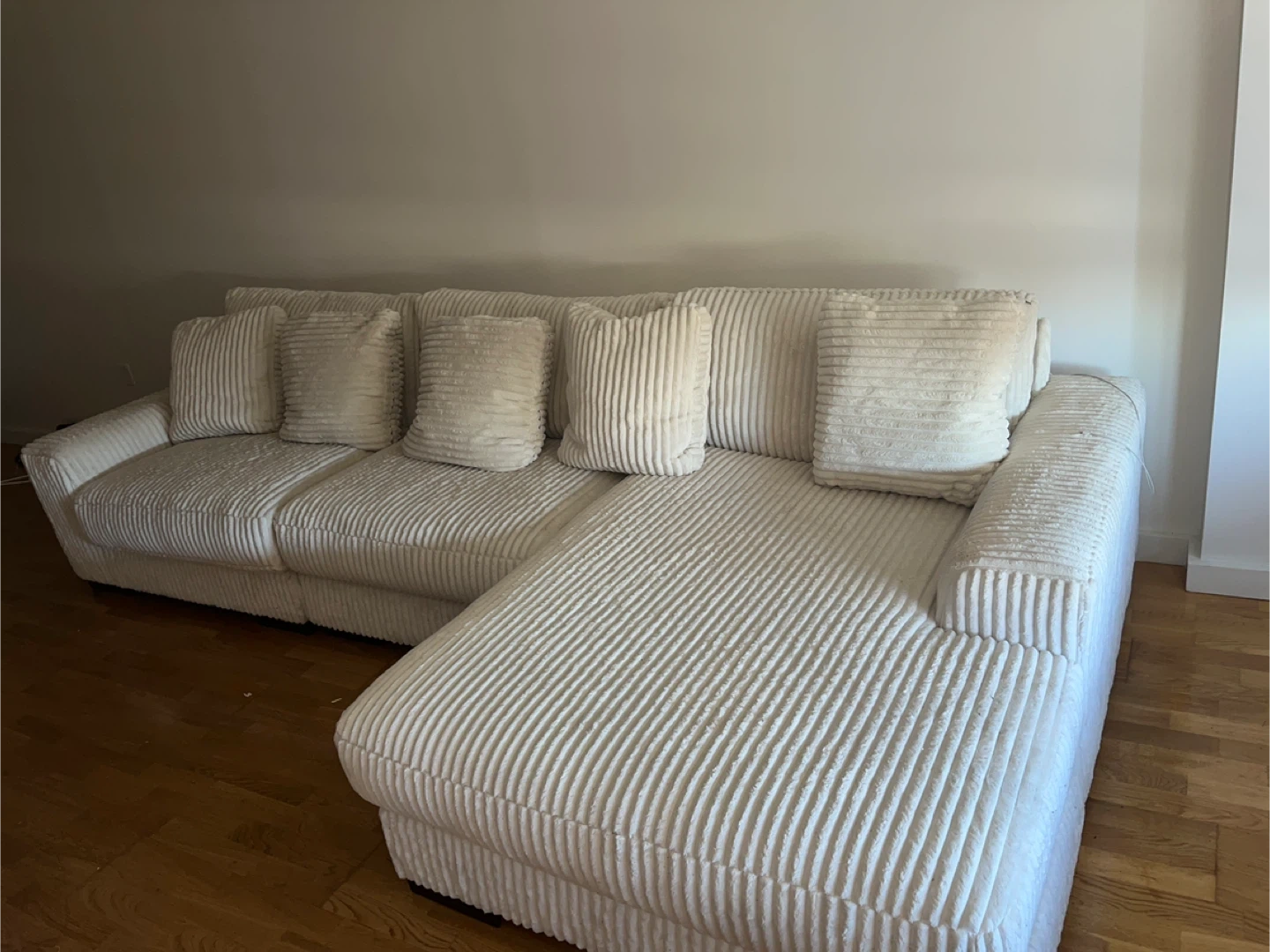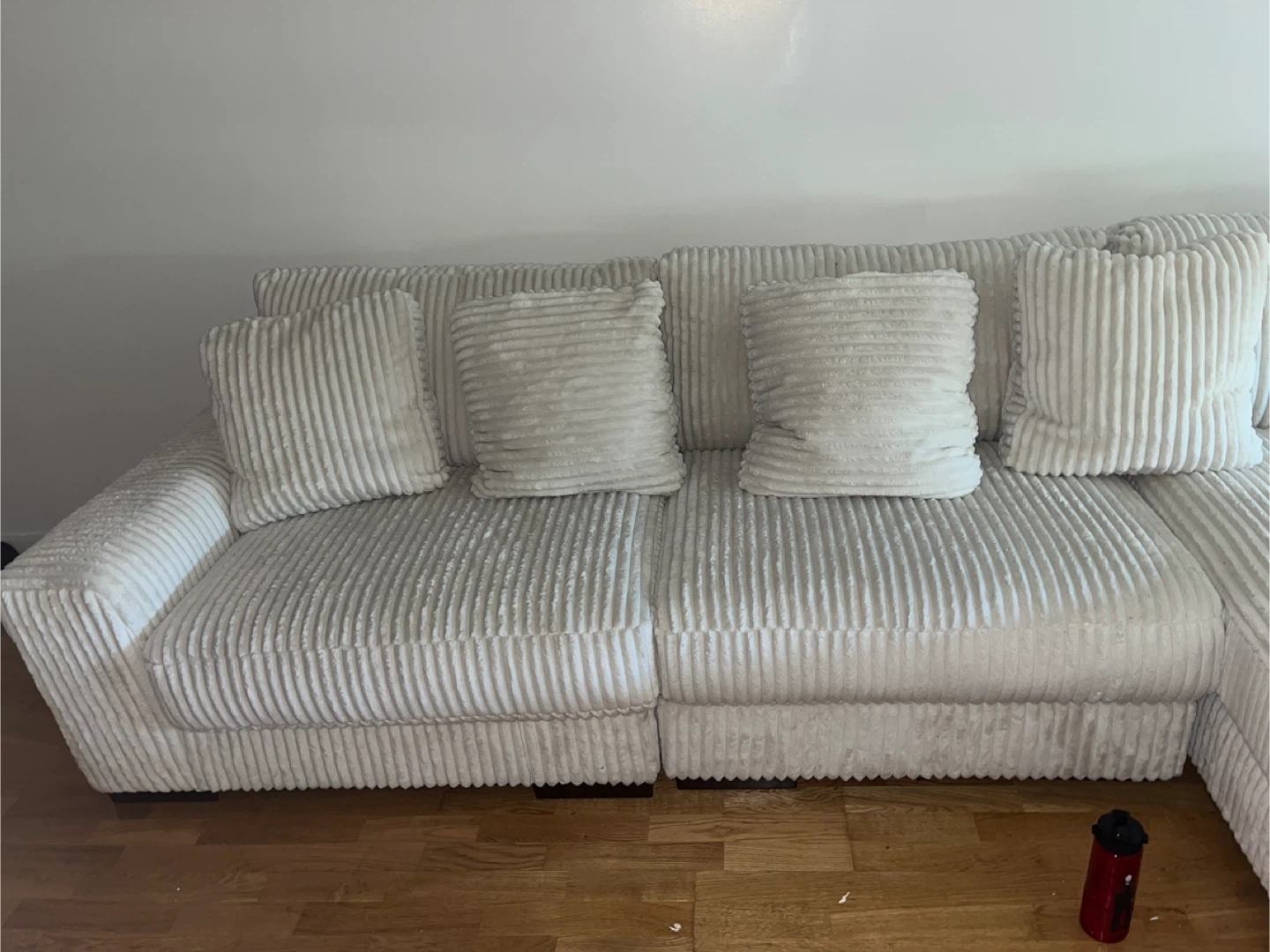 Selling a comfy white 3 piece corduroy sectional sofa. It comes with matching pillows, perfect for lounging and relaxing. The sectional design makes it great for maximizing space in your living room. It's in good condition and ready for a new home! i paid 1,300 just want a different color