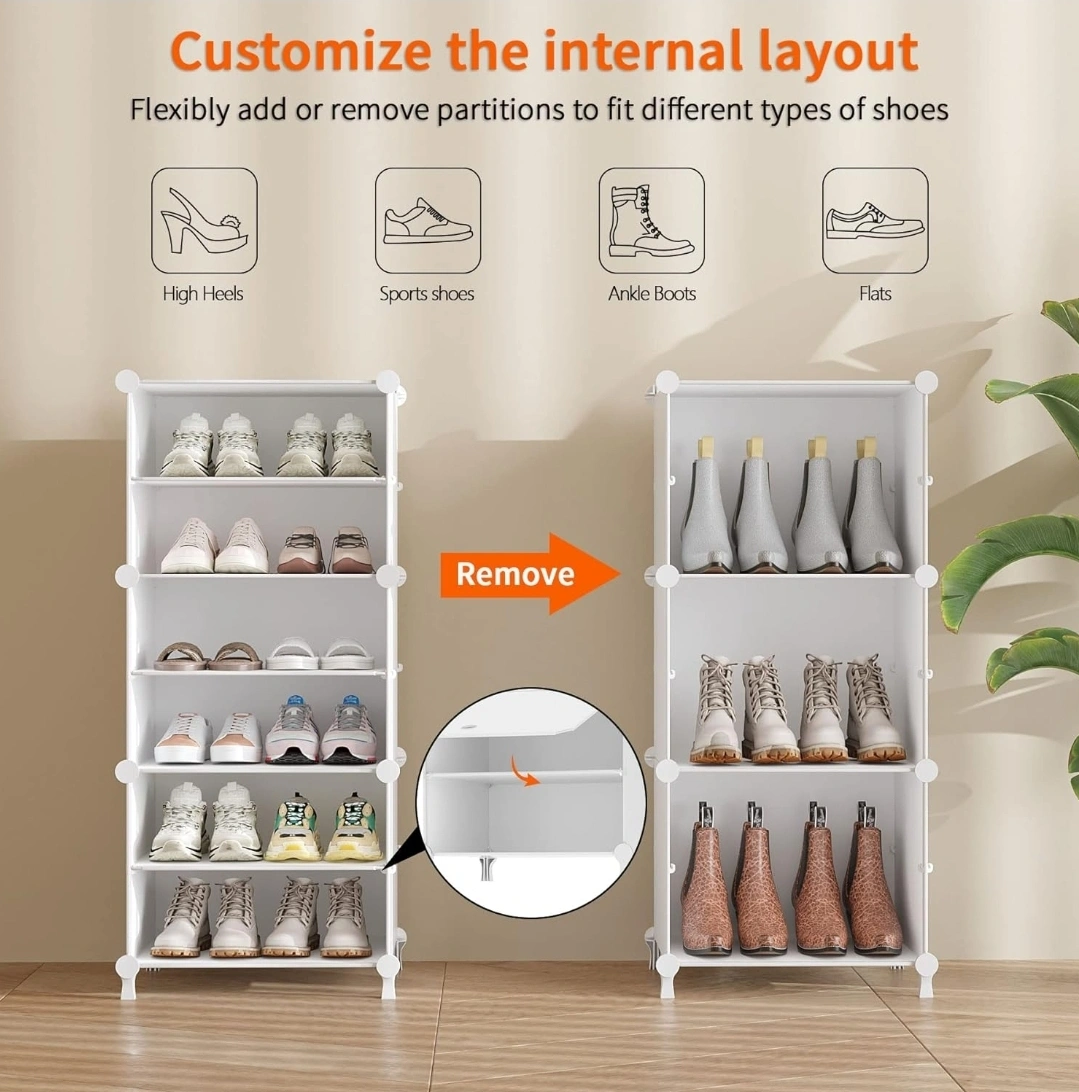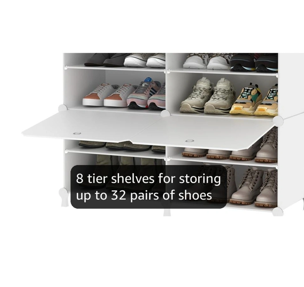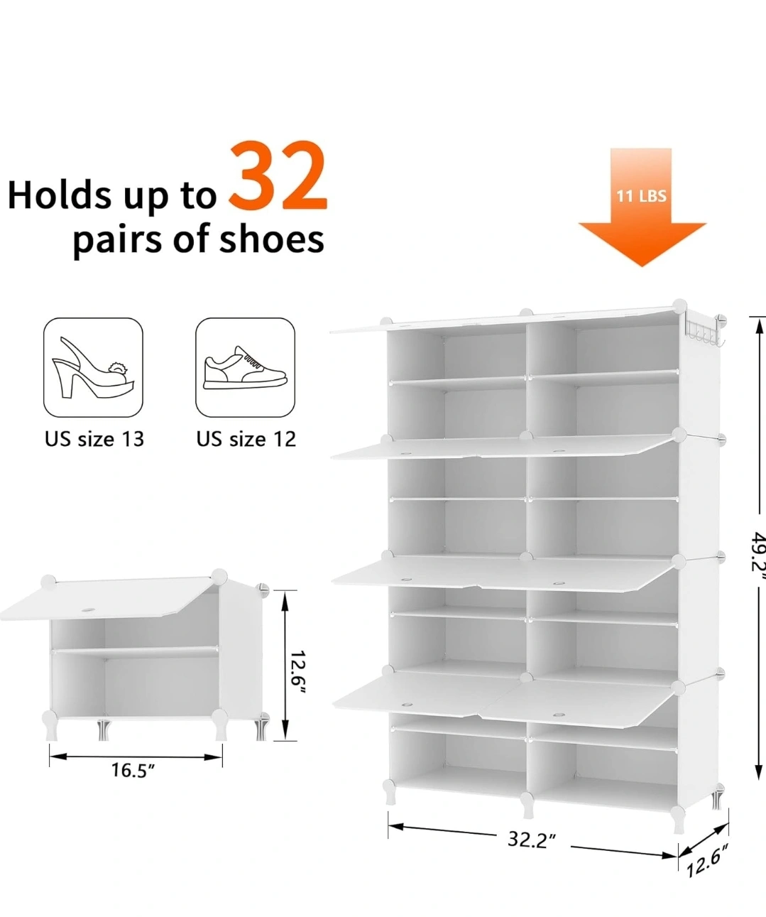 This white shoe rack organizer is perfect for keeping your shoes neat and tidy! It can hold up to 32 pairs of shoes. The dimensions are approximately 49.2" tall, 32.2" wide, and 12.6" deep. You can also customize the internal layout by adding or removing partitions to fit different types of shoes