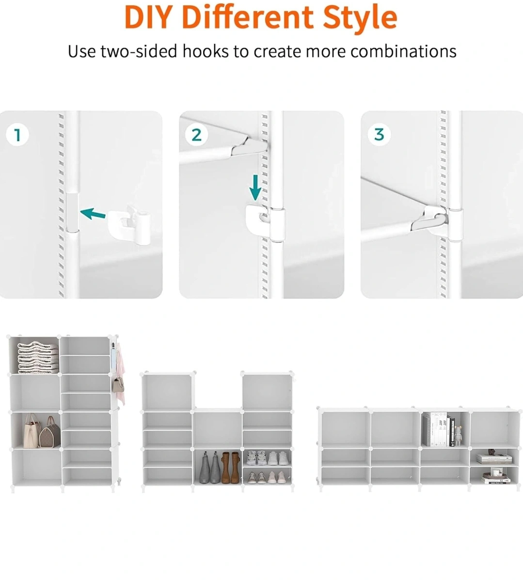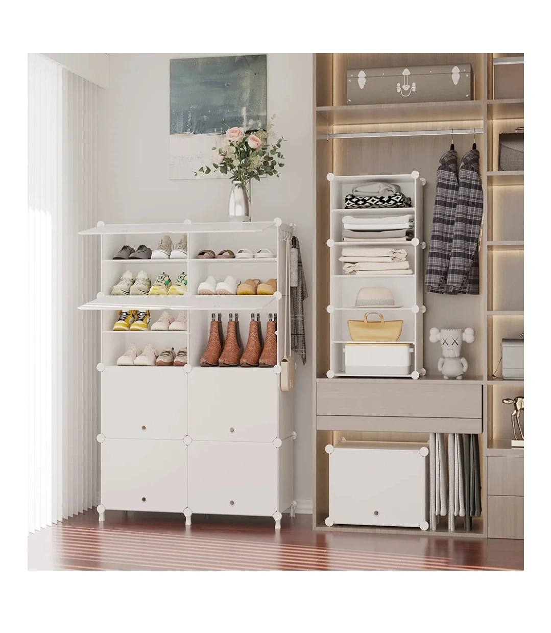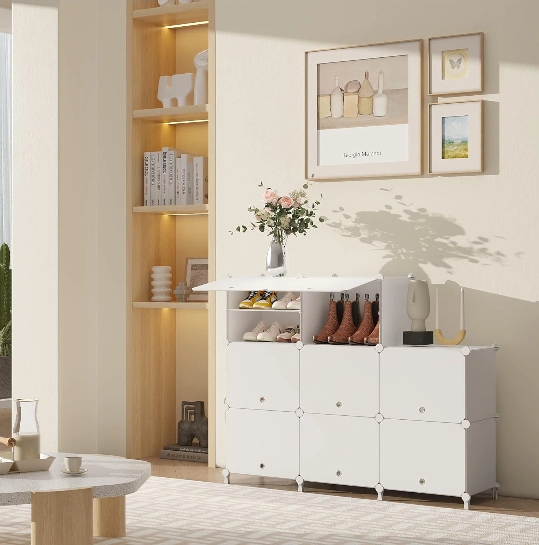 This white shoe rack organizer is perfect for keeping your shoes neat and tidy! It can hold up to 32 pairs of shoes. The dimensions are approximately 49.2" tall, 32.2" wide, and 12.6" deep. You can also customize the internal layout by adding or removing partitions to fit different types of shoes