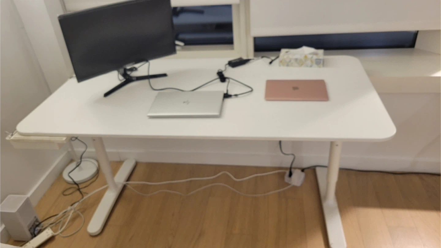 11Selling a white adjustable standing desk. It's in great condition and perfect for a home office setup. The desk is height-adjustable, making it comfortable for anyone to use. It's a sturdy and reliable desk!