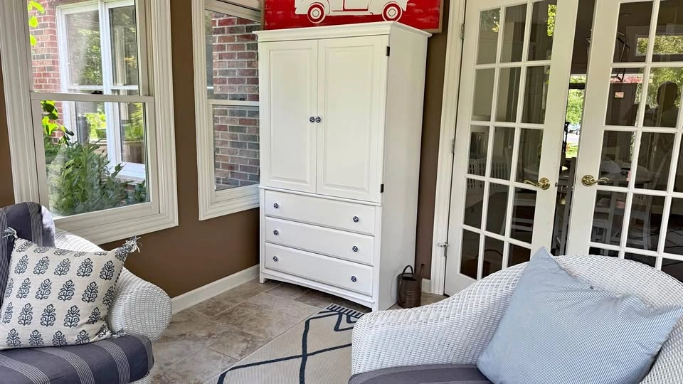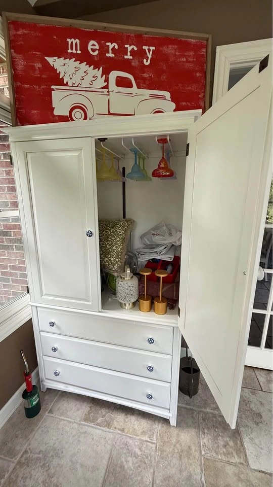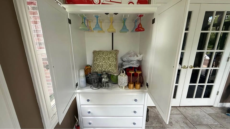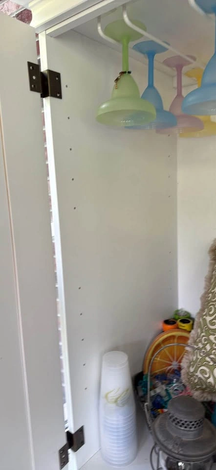 Very well maintained with solid drawers and holes in the back wall for wire organization; tray on ceiling to hold stemmed glasses; holes on interior sides for shelves; 42.5”w, 72”h, 23”d