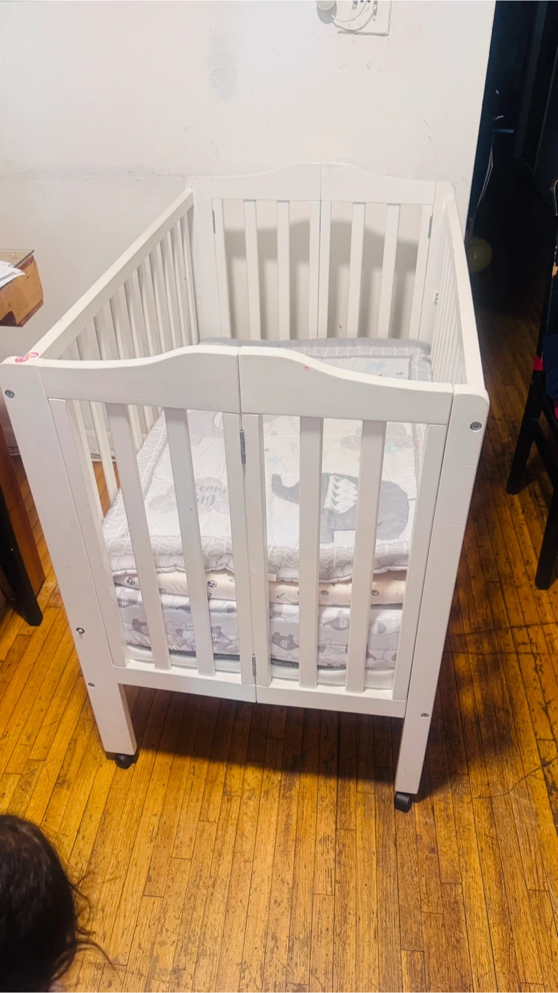 Selling a white baby crib. It's in good condition and comes with a mattress. Perfect for your little one!