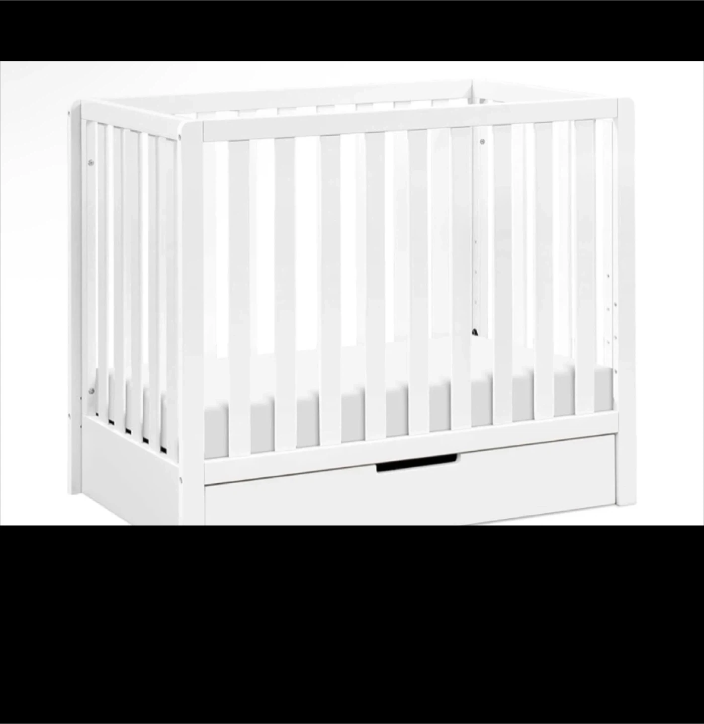 Selling a cute white baby crib! It's in great shape and has a convenient drawer underneath for extra storage. Perfect for your little one's nursery