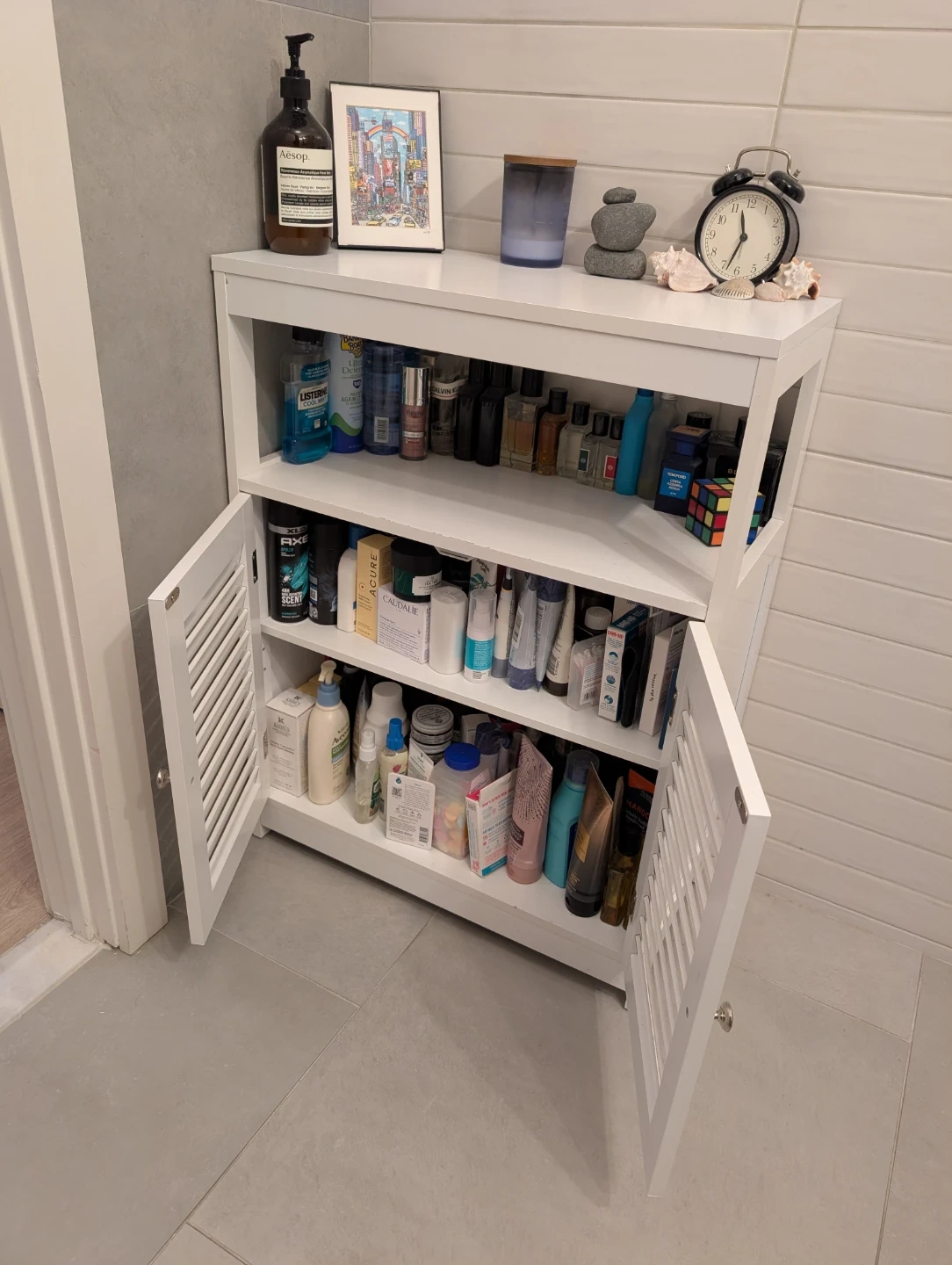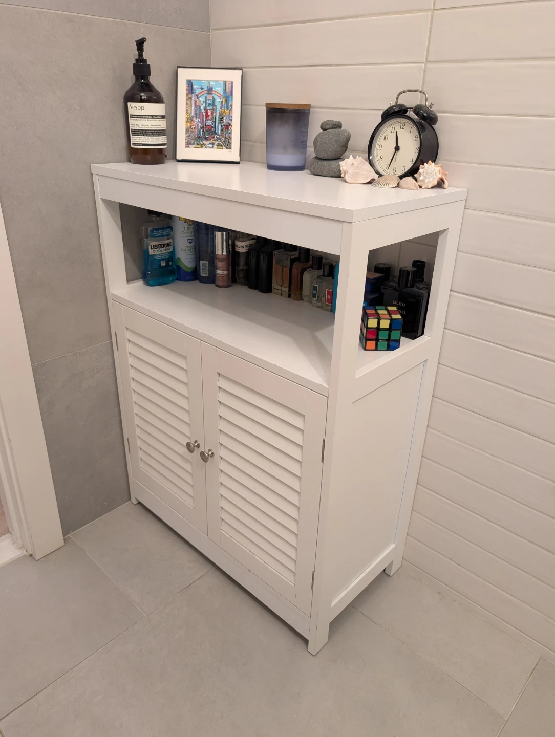 70Nice white bathroom cabinet! It has doors to keep everything tidy and organized. It's perfect for storing toiletries, or anything else you need to keep handy in your bathroom. It's in great condition and ready to find a new home! 31.5" x 23.5" x 12"