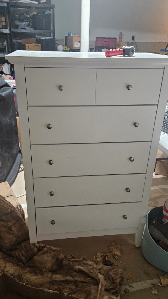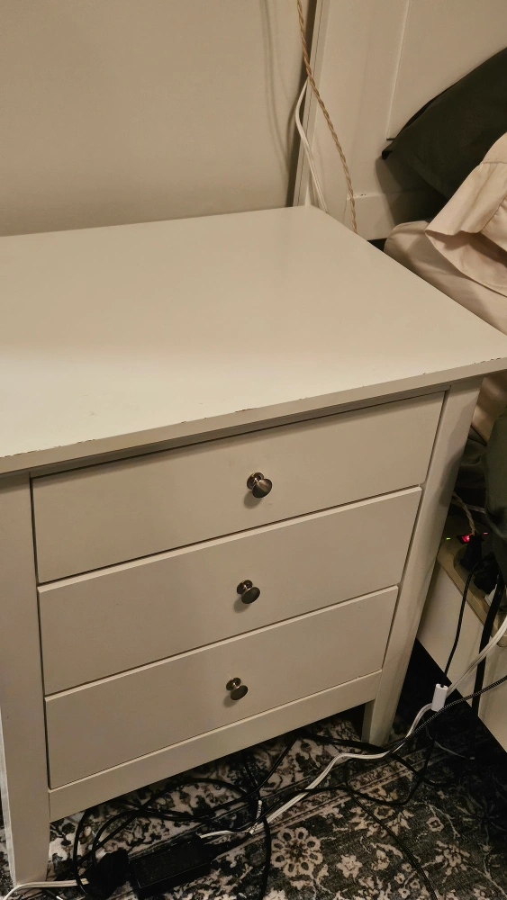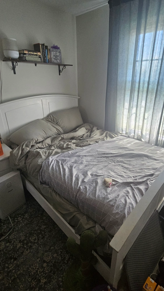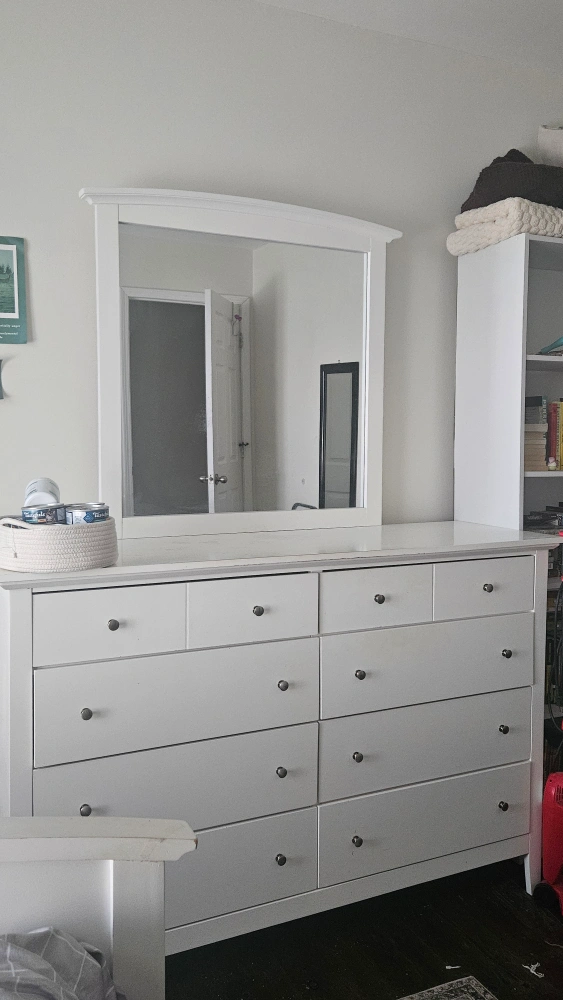 White bedroom furniture set. Includes a large dresser with a mirror, a smaller nightstand, and a full-size headboard. Some wear and tear. Solid wood construction. Can include mattress and box for and extra 100