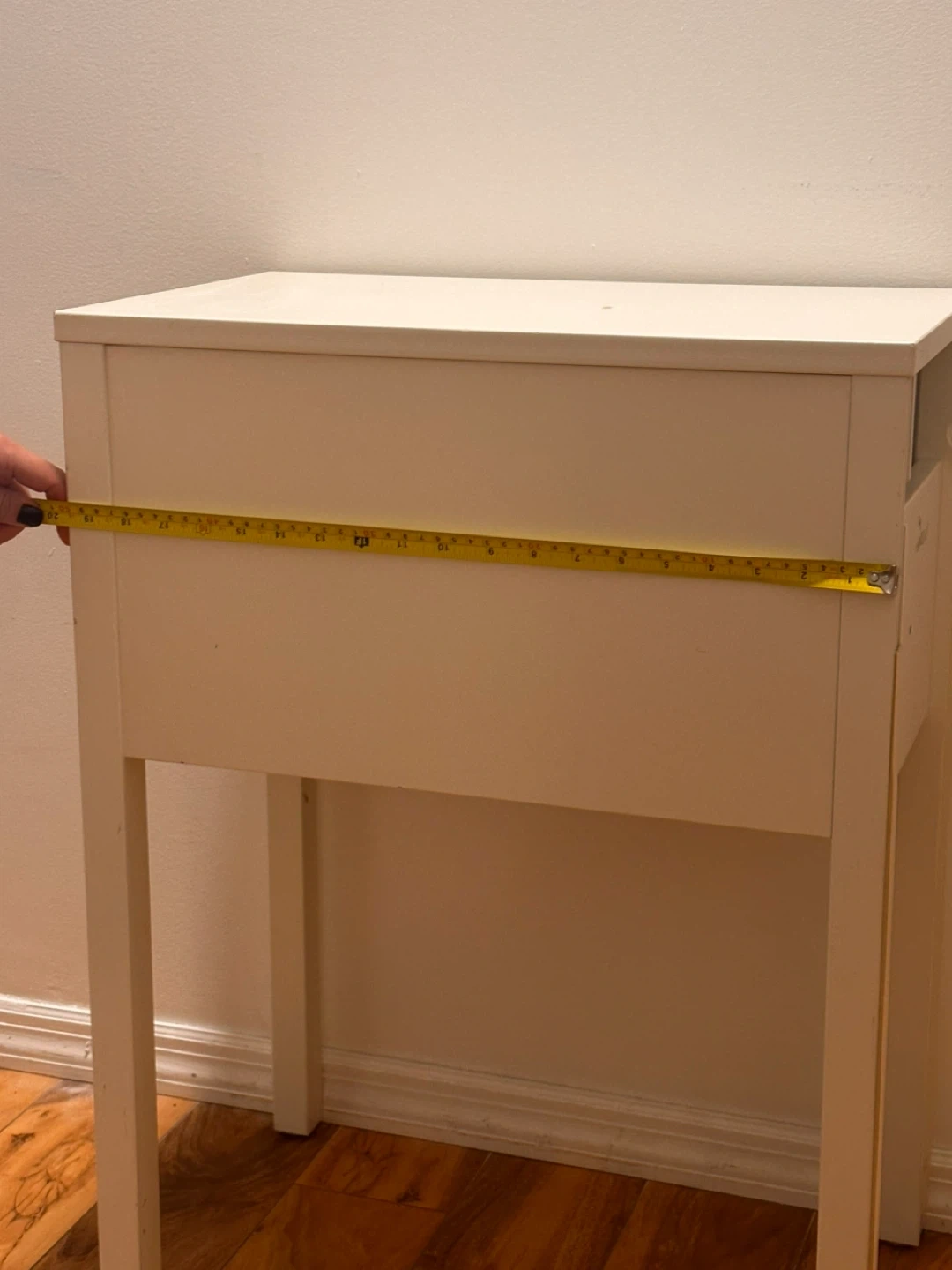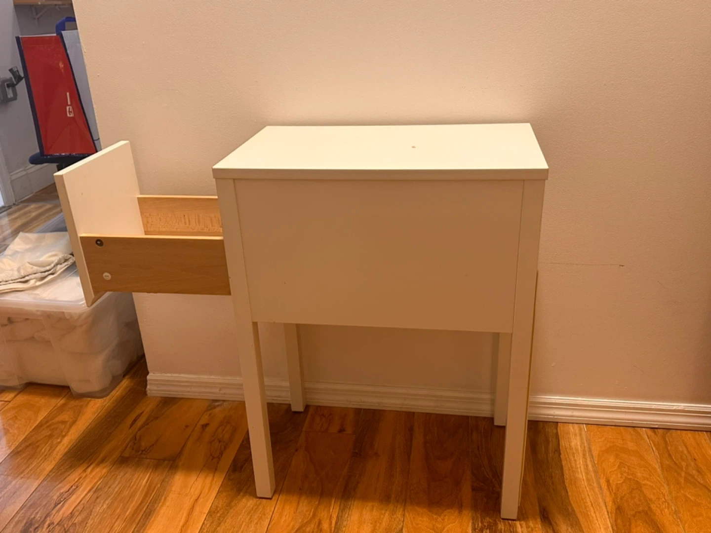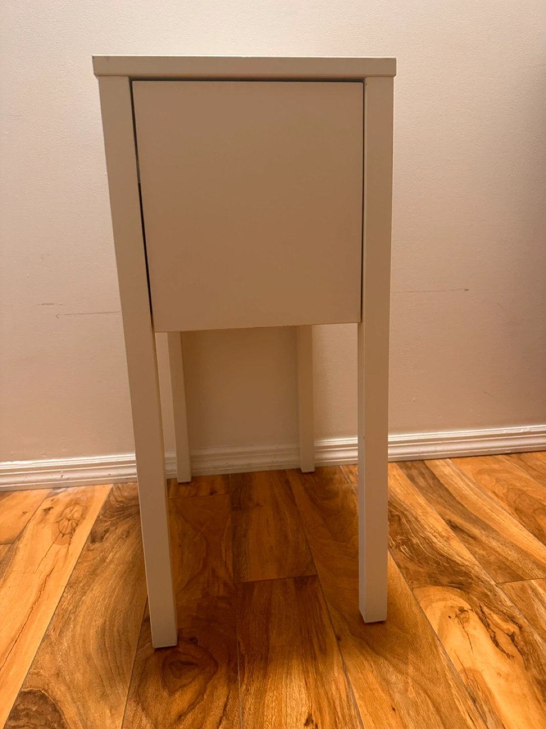 Selling a cute white bedside table! It has a handy drawer for storage. The table is in good condition and ready for a new home. The dimensions are approximately 26 inches in height and 20 inches in width