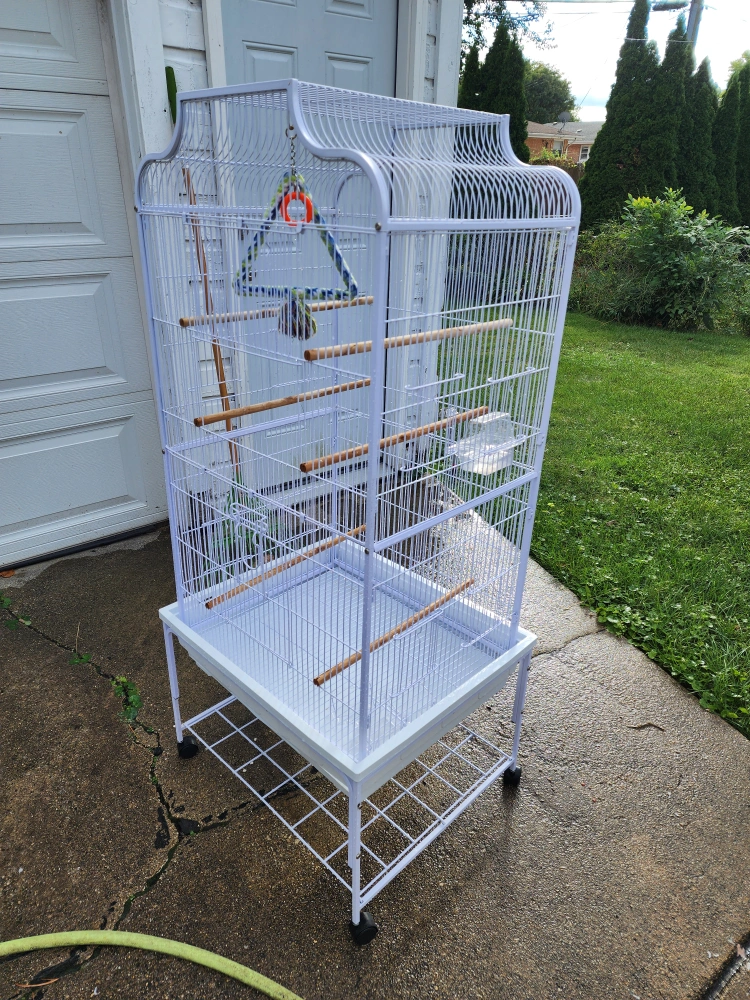 Selling a white bird cage that comes with a stand. It includes perches, a water dispenser,3 food dispensers and a toy. Perfect for your feathered friend!