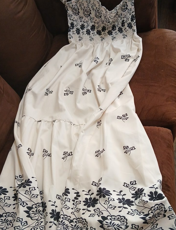 10This is a white dress with a black floral print. It features an elasticized neckline and a tiered skirt. The dress appears to be in good condition and ready for a new home!