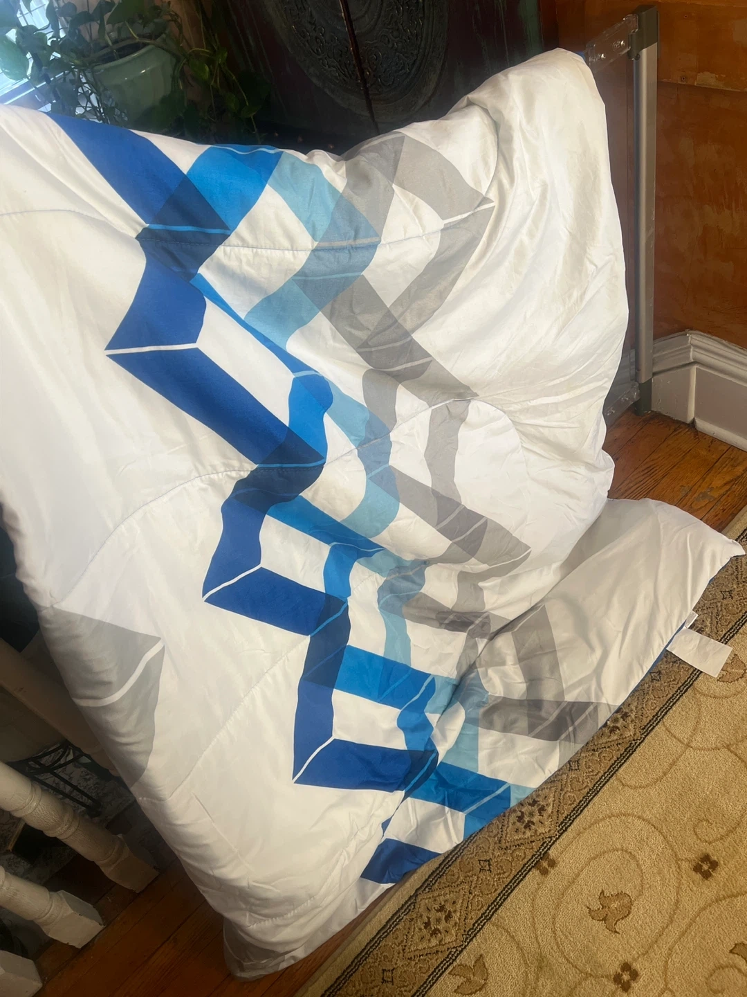 10Selling a cozy comforter with a geometric blue and gray design on a white background It's in great condition and ready to keep you warm