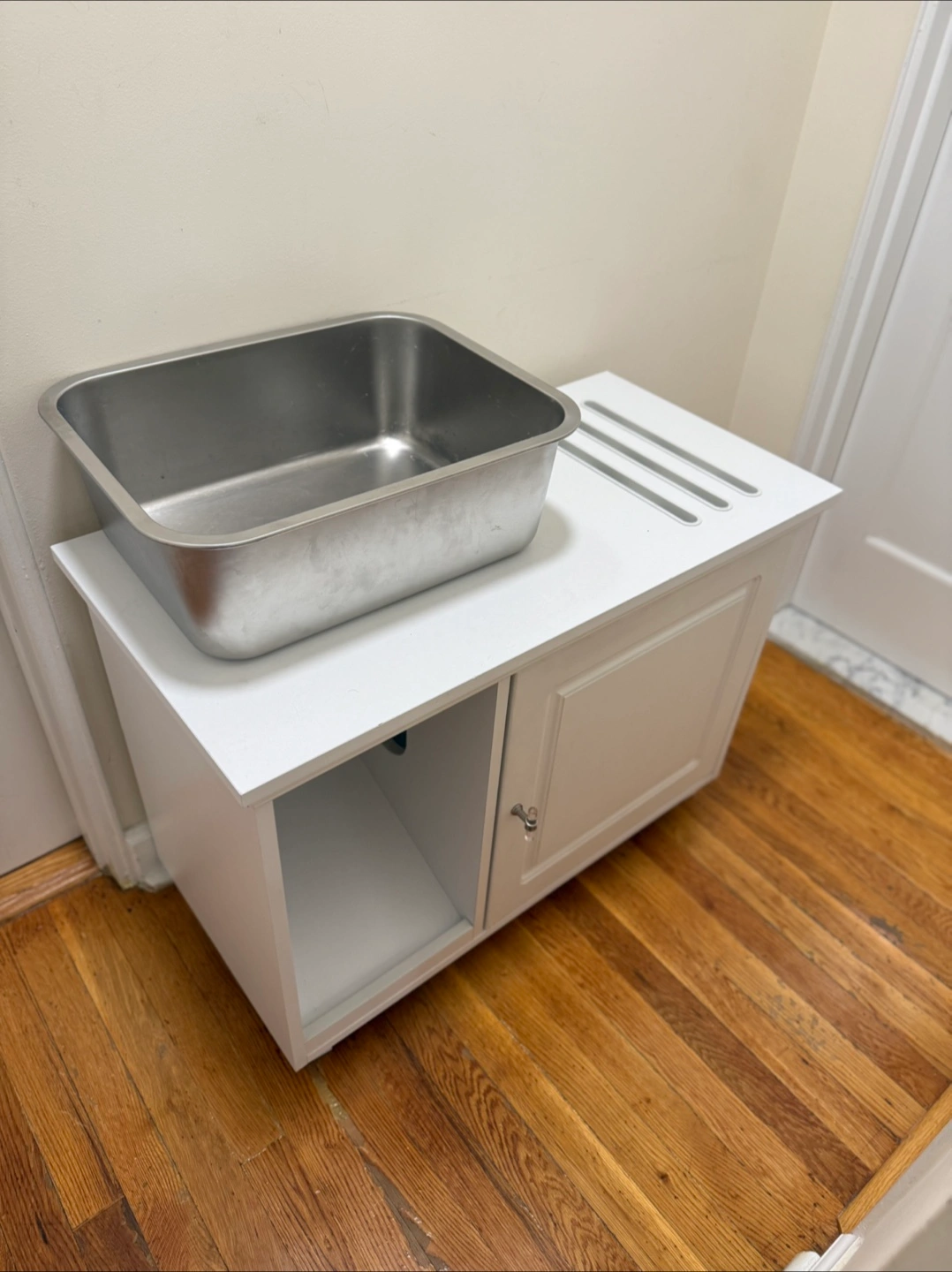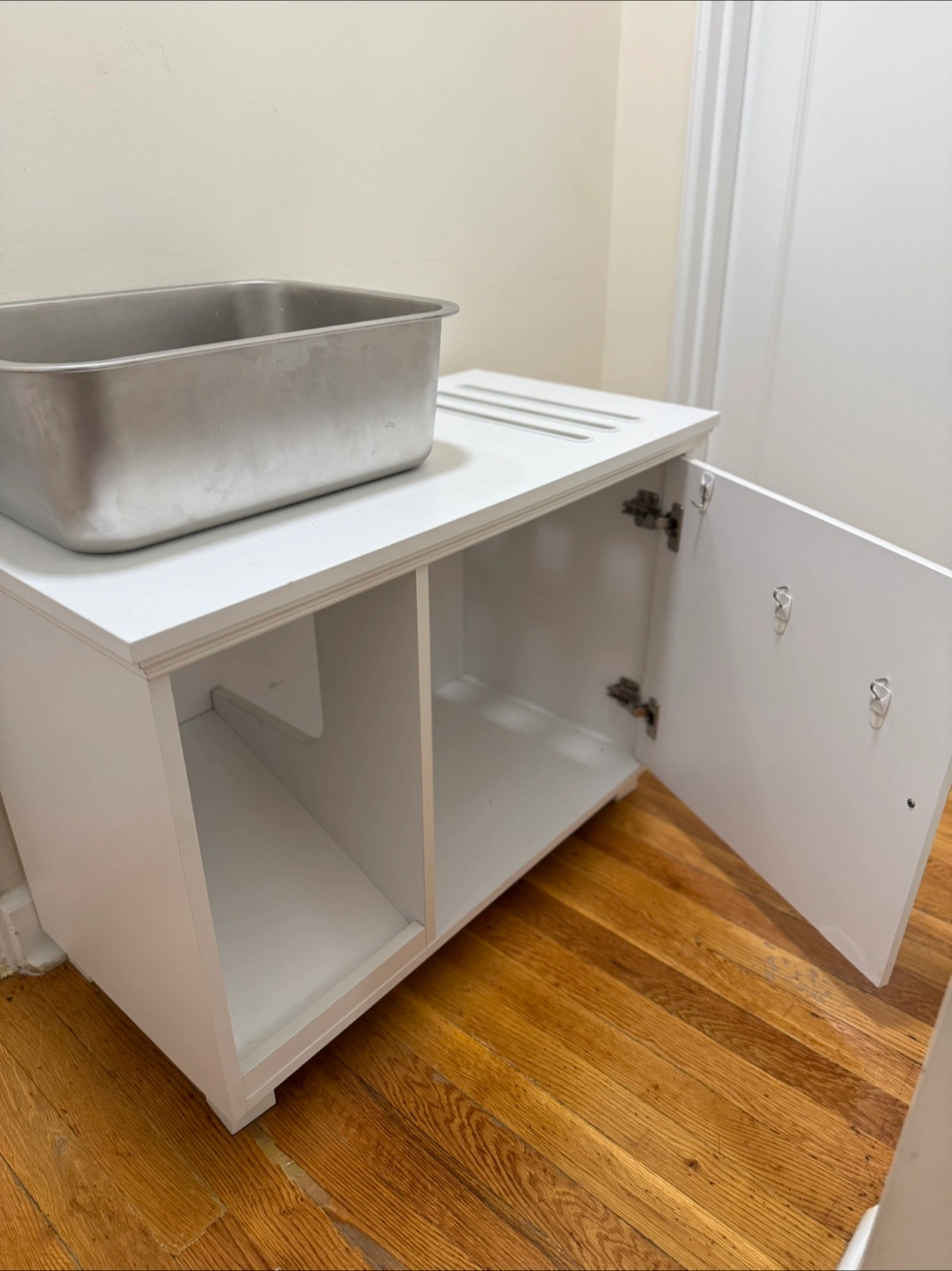 Selling a white cat litter box enclosure! It’s in good condition and a stylish way to hide your cat's litter box. The cabinet has a door for easy access and cleaning. Comes with a stainless steel litter box for great sanitation and easy litter scooping! *Just litter box alone selling for $40*