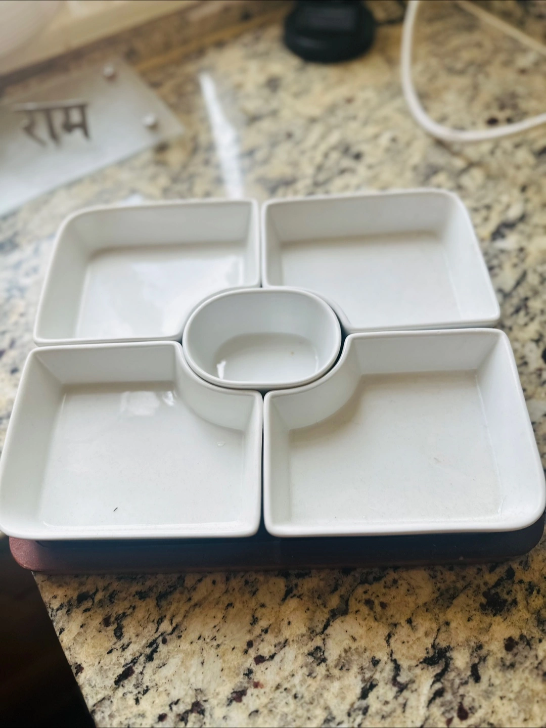 Five-sectioned white ceramic serving dish. Rectangular and oval shapes. Wooden base. Perfect for snacks, appetizers, or dips.