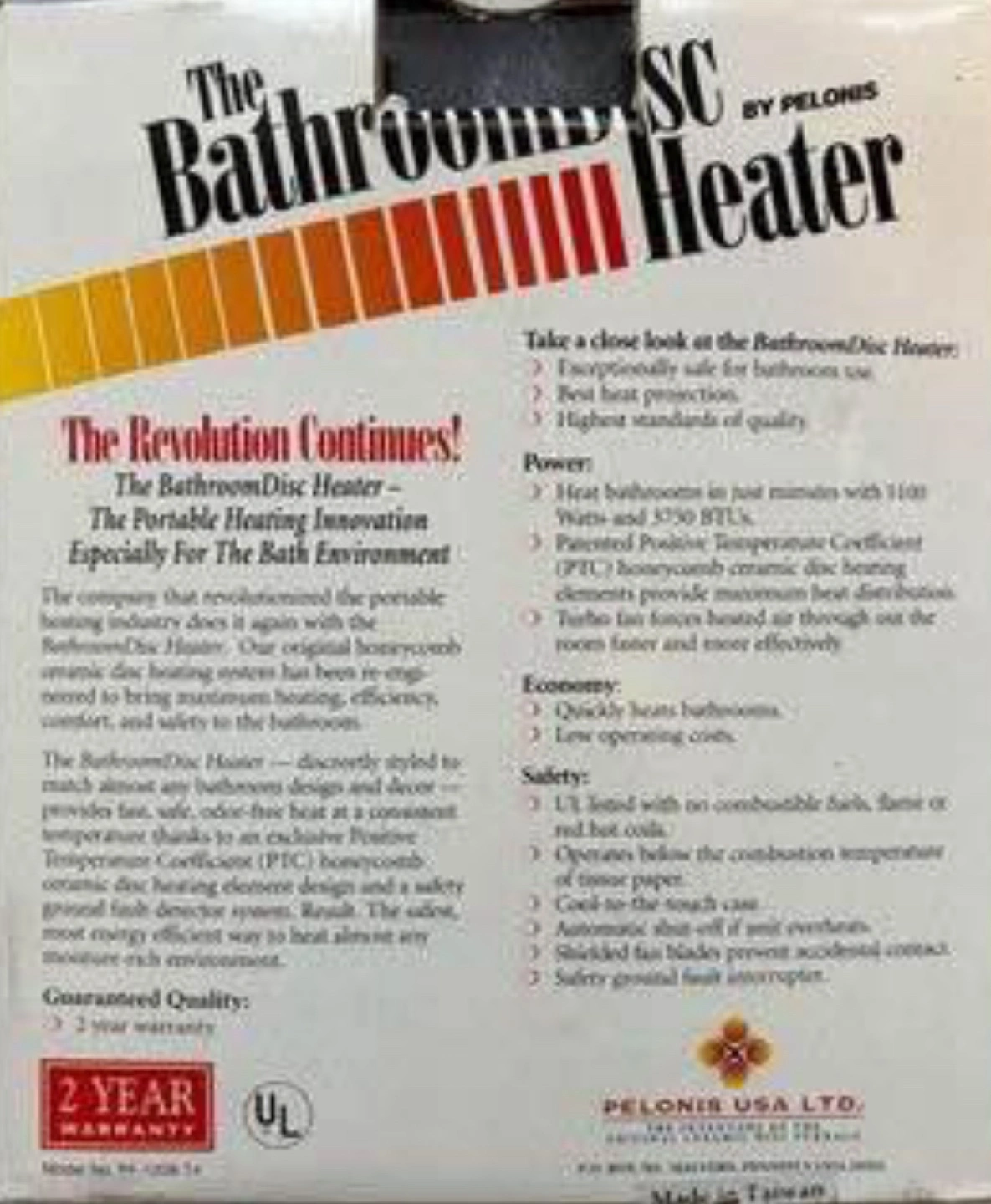 White Ceramic Bathroom Space Heaters (with ground fault interrupter) 1100 W Never Used Tested and Works Parabolic/Disc Heating: A disc space heater, also known as a parabolic heater, uses a curved reflector to focus and amplify heat output. The reflector is bowl-shaped and reflective, and concentrates infrared heat in a specific direction. This creates a beam of warmth that other types of heaters don't offer. $28 each, 2 Available ($48 for both)