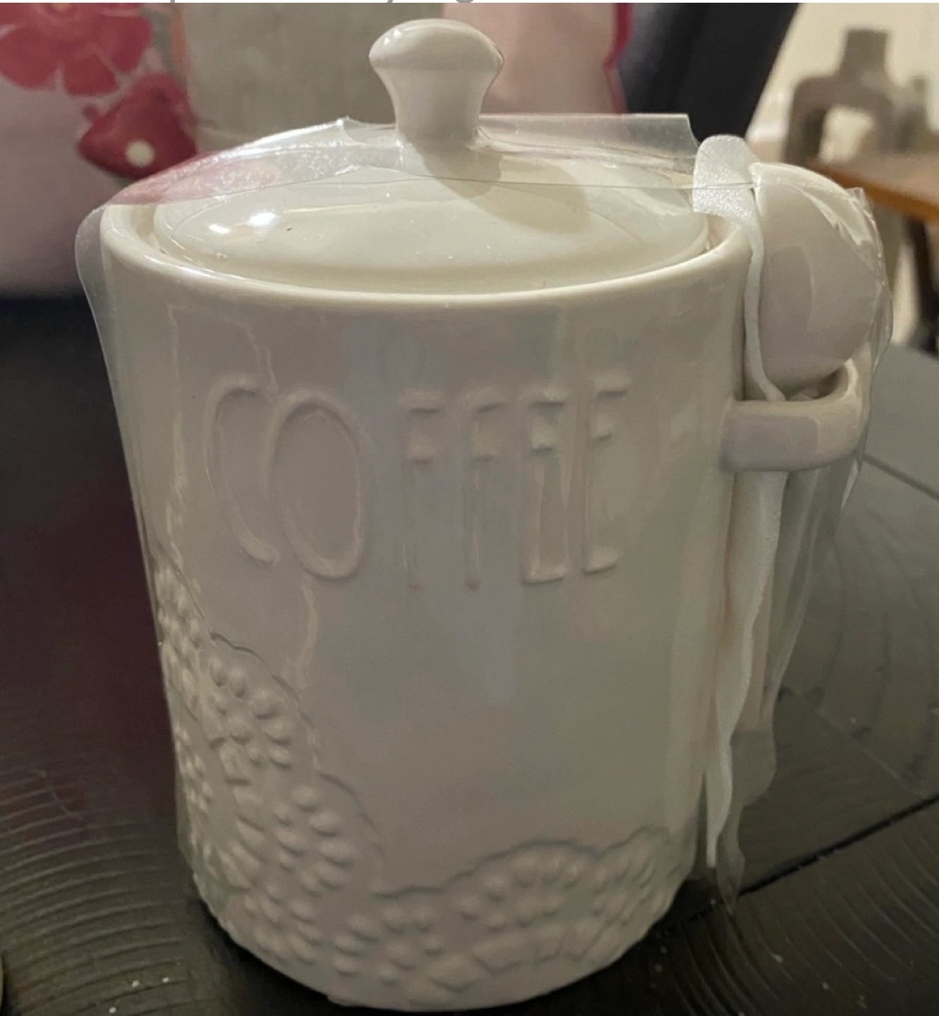 Adorable white ceramic coffee canister. Features embossed detailing and word Coffee. Includes matching spoon and rubber seal.