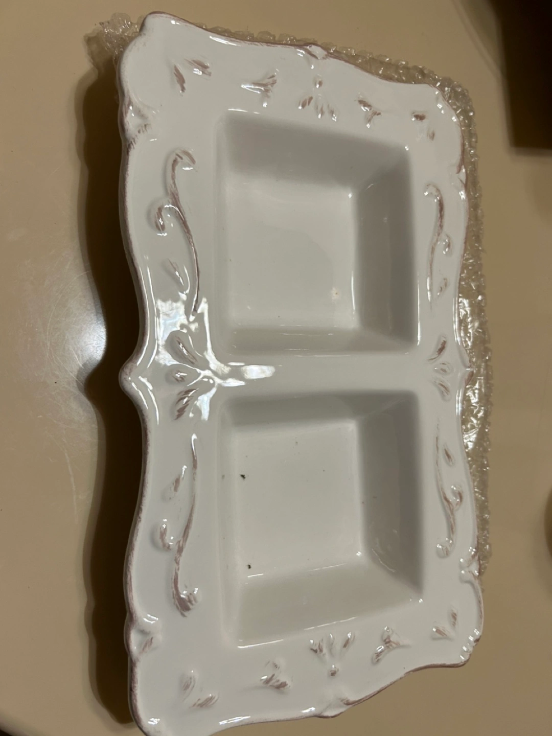 10Selling a lovely white ceramic divided serving dish! It features an elegant, ornate design around the edges. Perfect for serving snacks or appetizers at your next gathering!