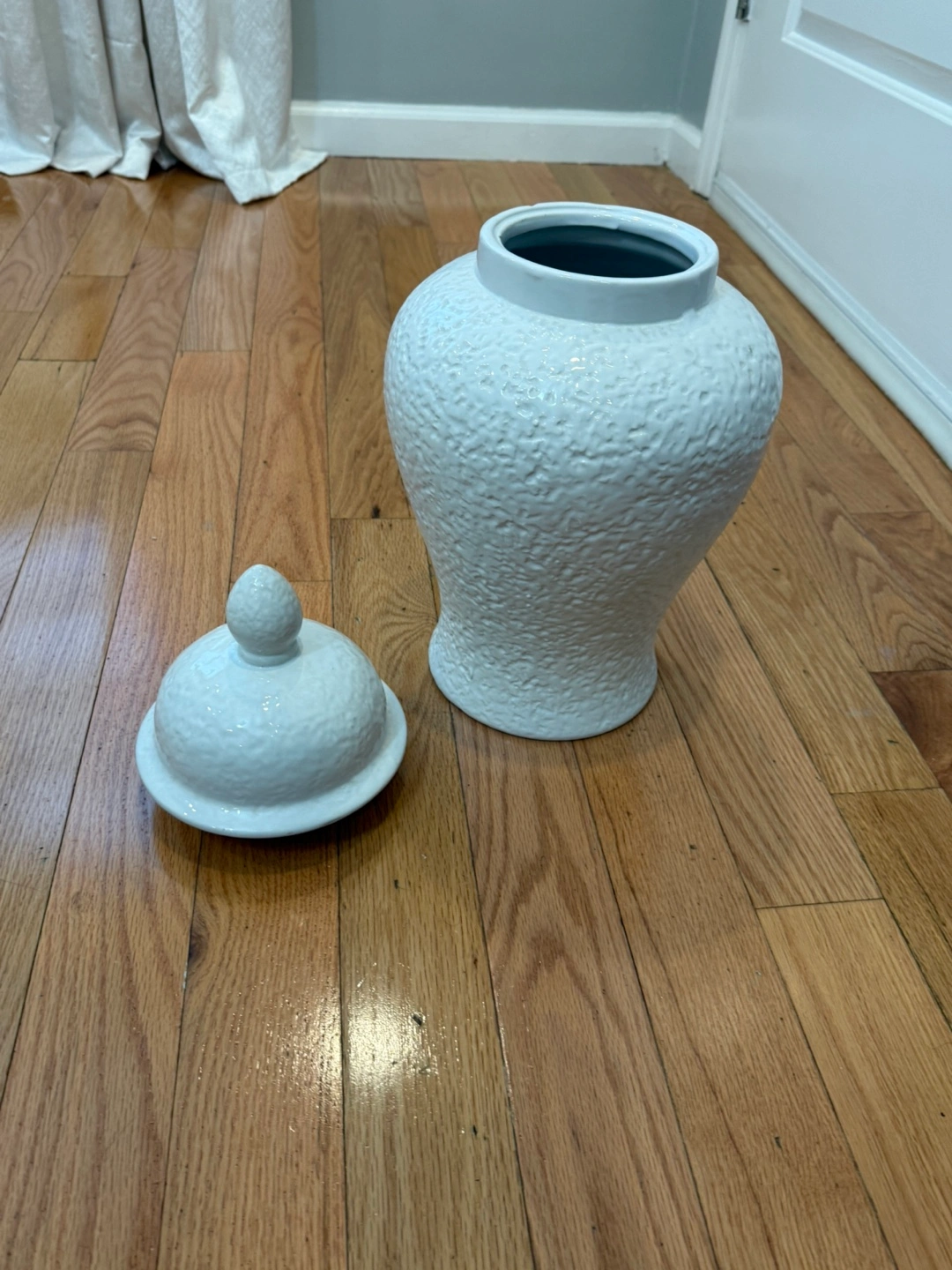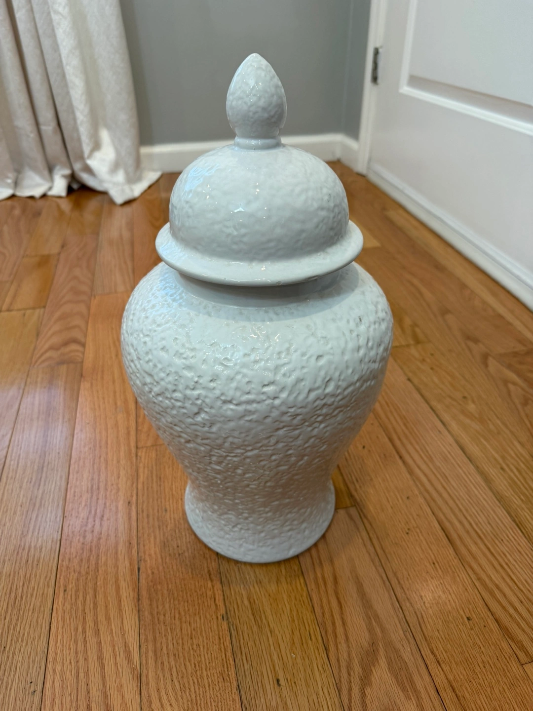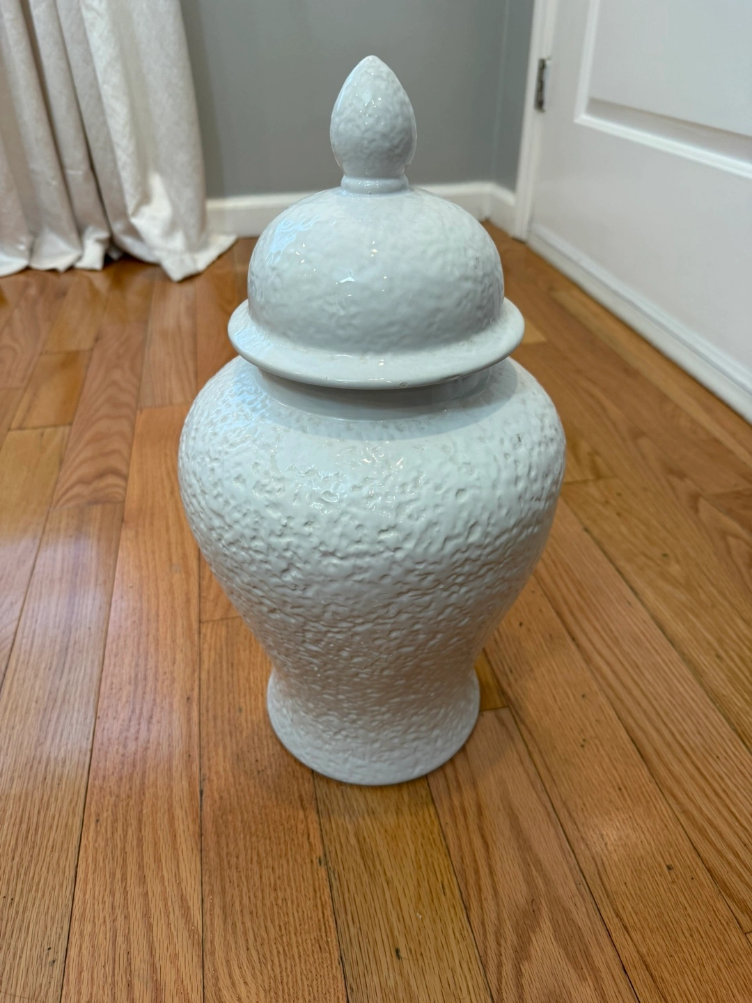 Selling a lovely white ceramic ginger jar! It's in great condition and would look beautiful as a decorative piece in any room. The jar comes with a matching lid, completing its elegant look. Perfect for adding a touch of sophistication to your home decor