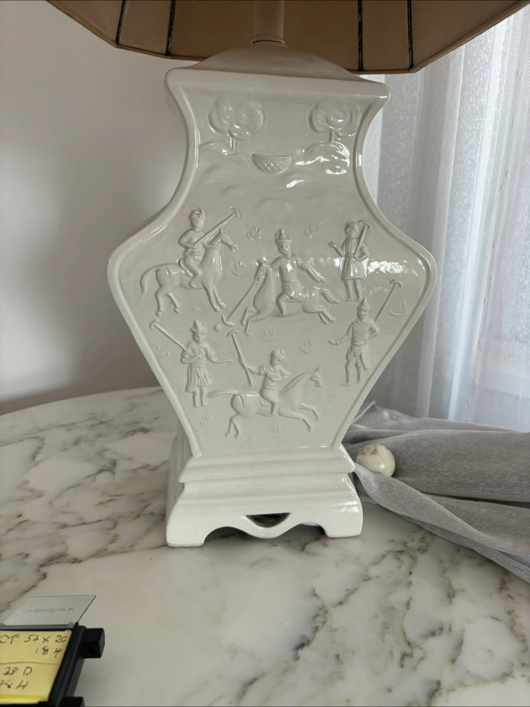 Ceramic lamp, white in color. Features relief details of people riding horses and holding sticks. Includes a lampshade. Place it on a side table for a relaxing glow.