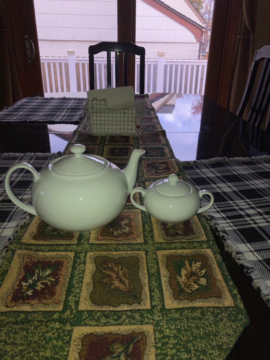 23Here's a lovely white ceramic teapot set. It includes a teapot and a sugar bowl with a lid. Perfect for tea time!