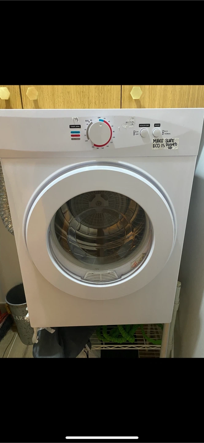 Selling a used white clothes dryer. It's in good working condition and ready to help with your laundry needs! Really good for a small apartment 19 by 17
