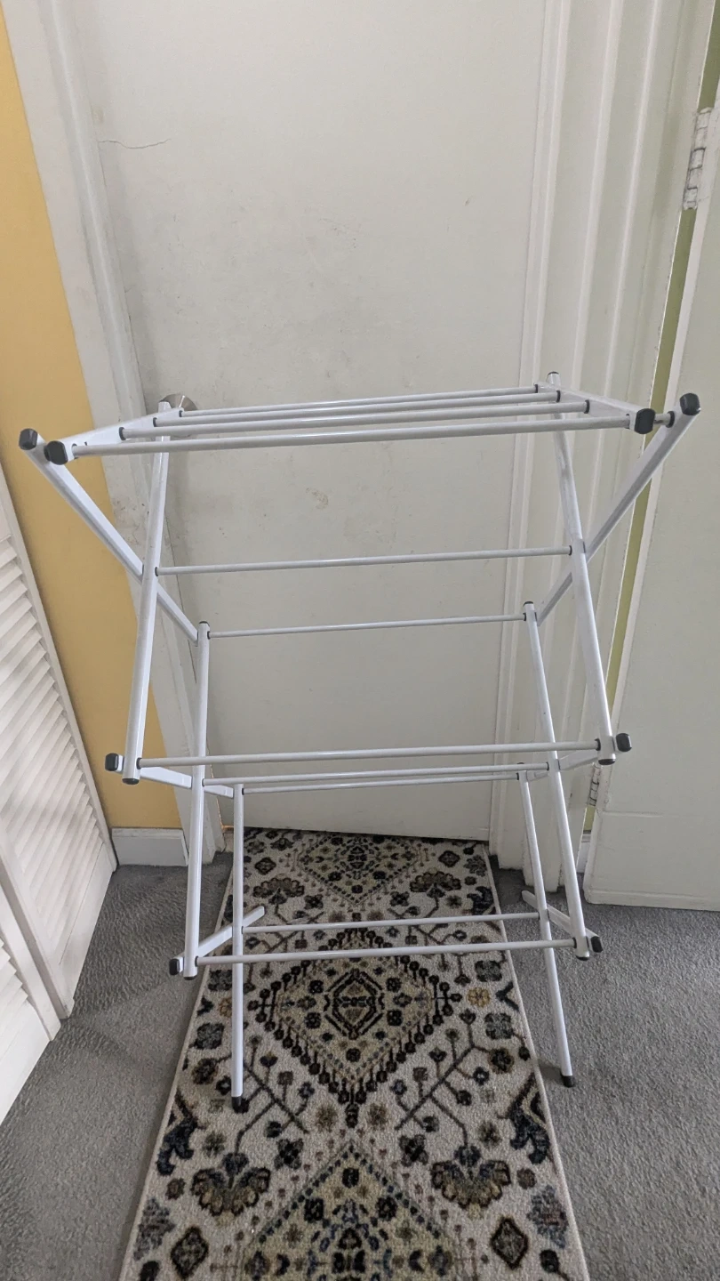 84Here is a white clothes drying rack! It's in great condition and ready to help you save on dryer costs. Perfect for apartments or anyone looking to air dry their clothes.