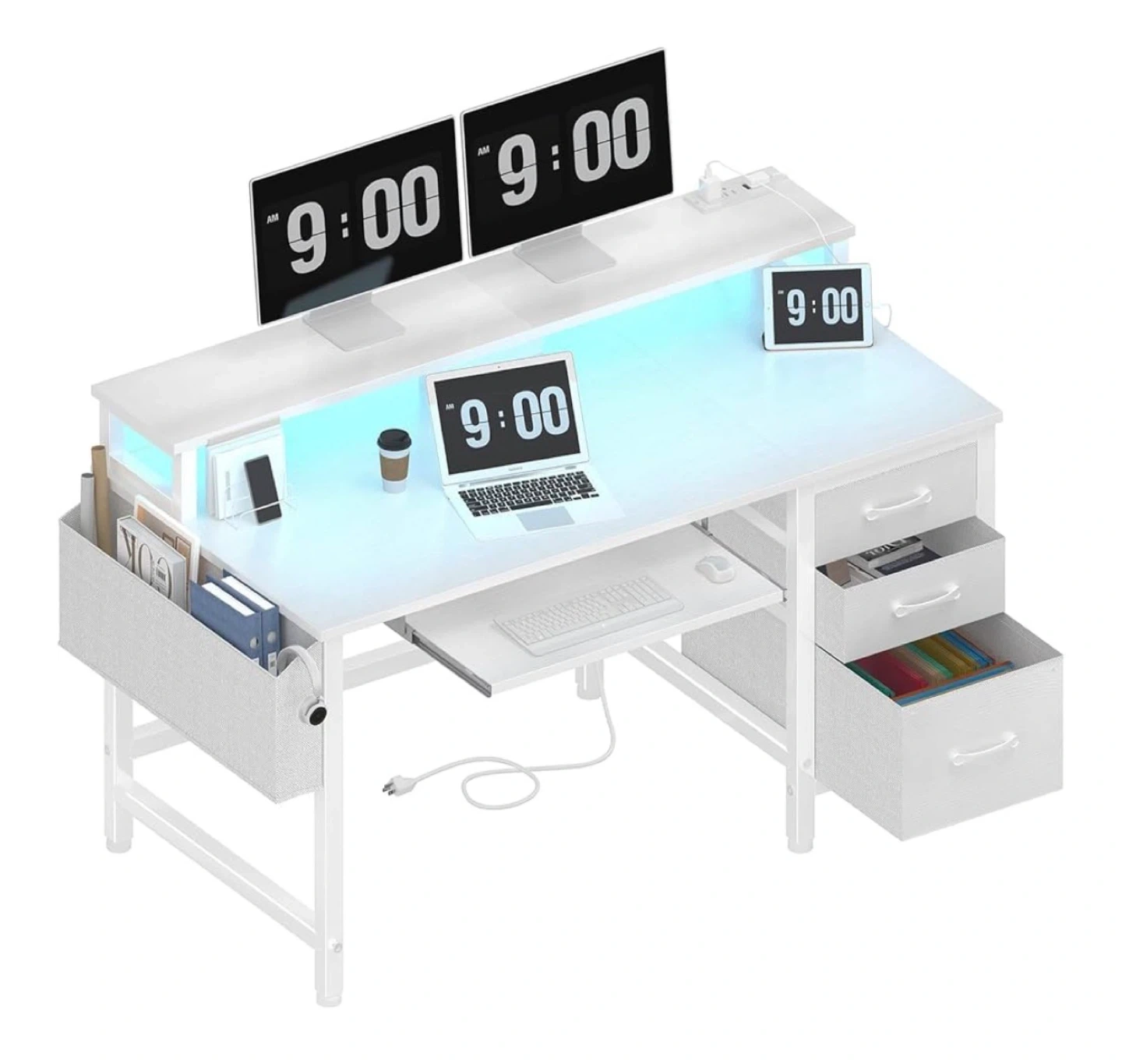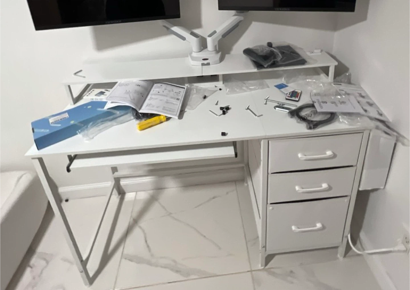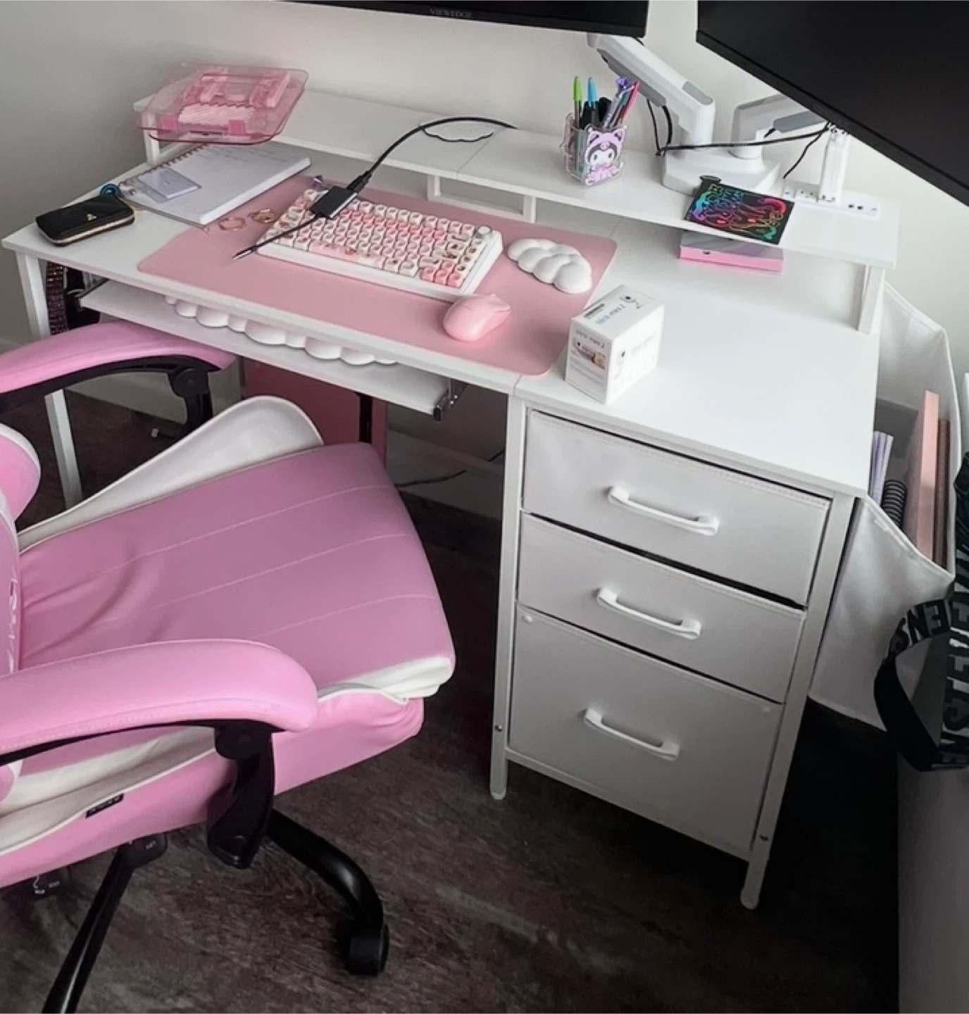 Selling a white computer desk with drawers. It's in good condition and perfect for a home office or study space. The desk features a built-in keyboard tray and three drawers for storage. It also has a side pocket for holding books or other items
