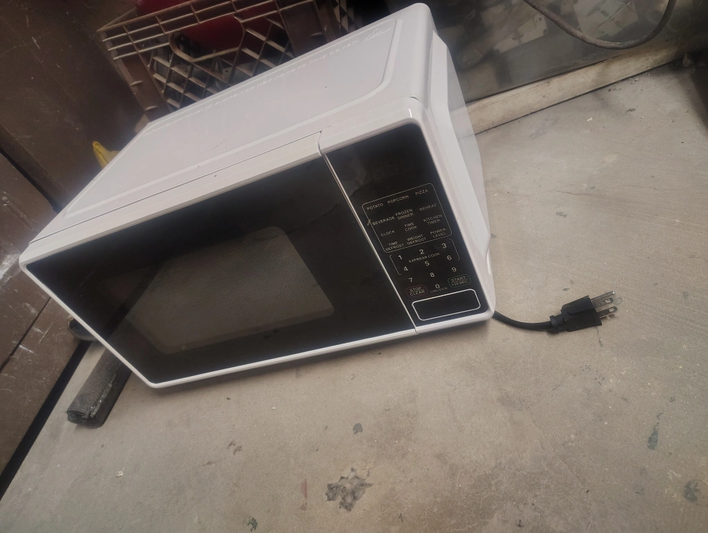Selling a countertop microwave in white. It's in good condition almost new and ready to heat up your meals! Features include settings for popcorn, pizza, and beverages.