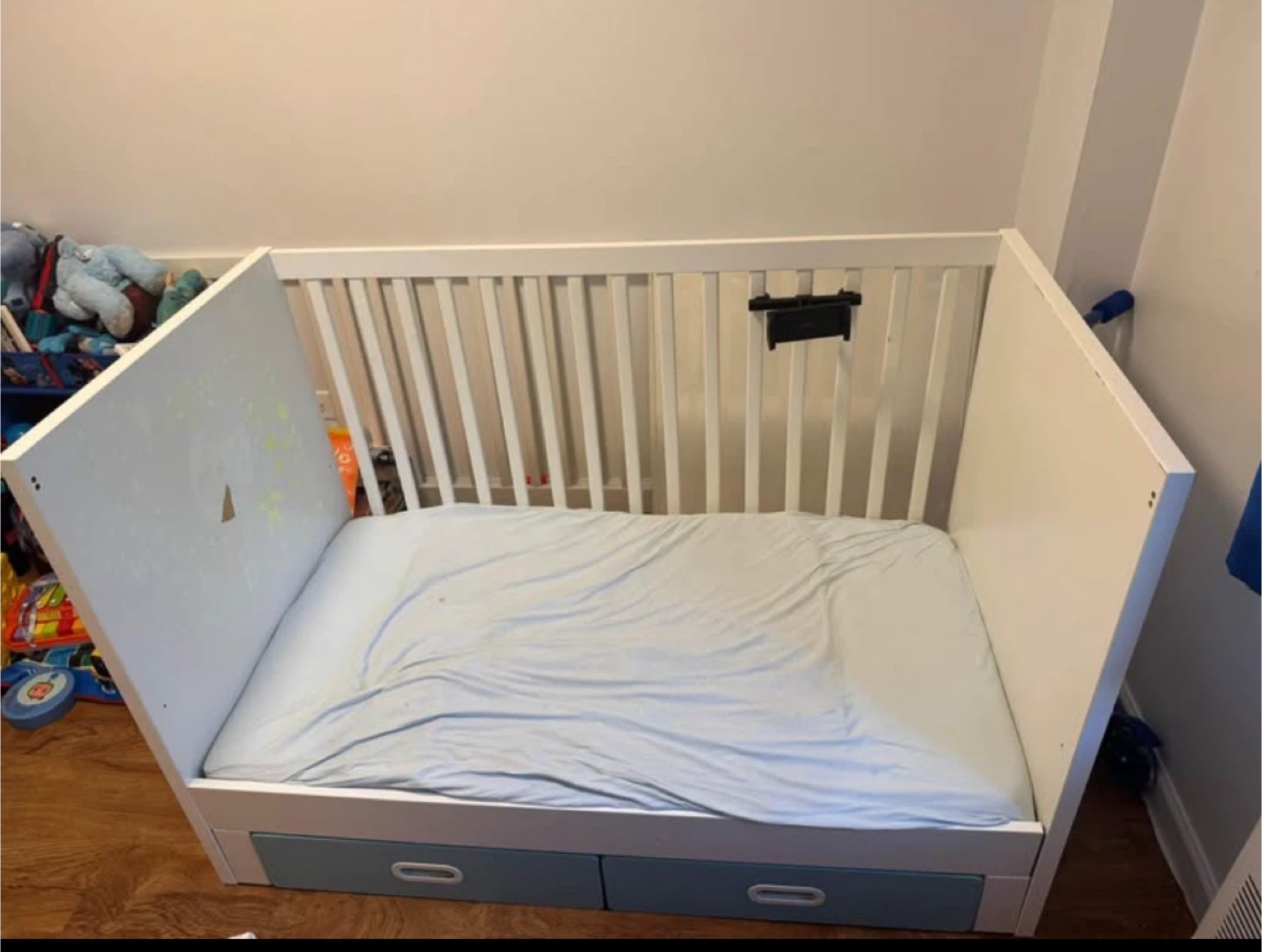 Selling a white crib that's perfect for your little one! It features a sturdy frame with blue drawers underneath for extra storage. The crib is in good condition and ready for a new home. Has all parts. Mattress included.