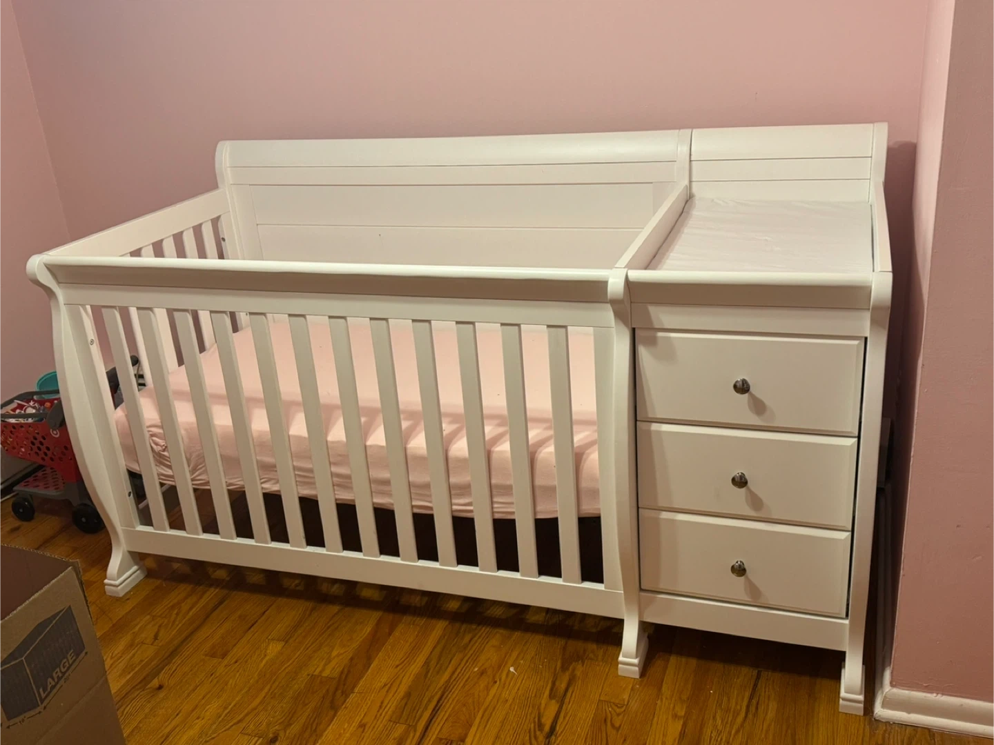 Selling a white crib with an attached changing table and three drawers. Perfect for a nursery! Crib and toddler bed